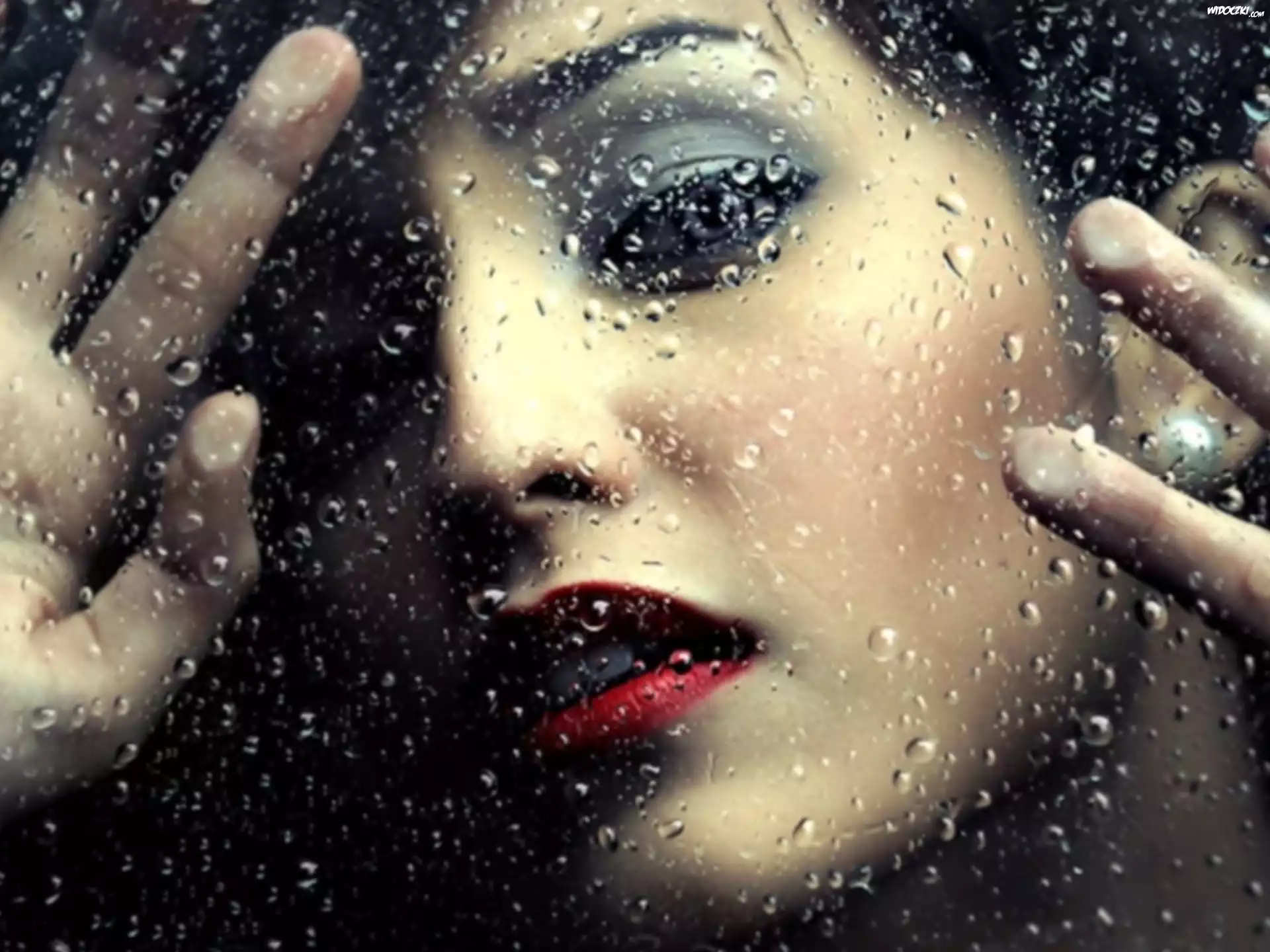 Zdjęcia, Smutna, Kobieta, Makijaż, Szyba, Deszcz