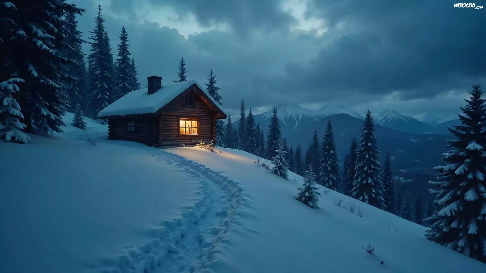 Zdjęcia, Zima, Drzewa, Dom, Śnieg, Droga, Góry, Chmury