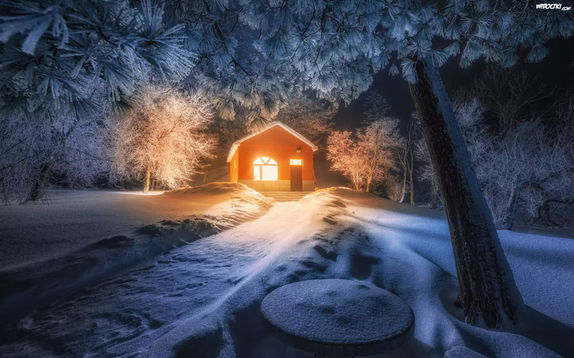 Zdjęcia, Zima, Drzewa, Droga, Dom, Las, Noc, Gałęzie, Śnieg