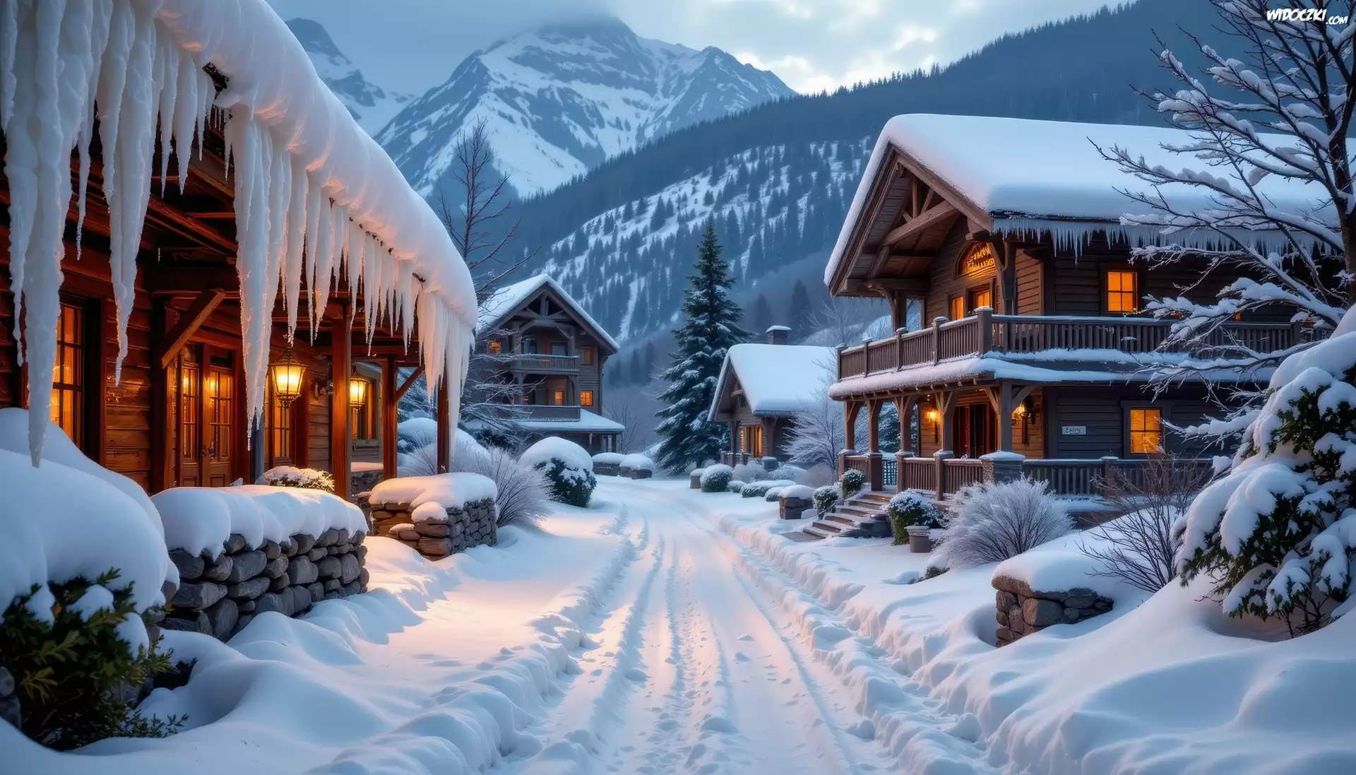 Góry, Domy, Zima, Śnieg, Sople, Droga