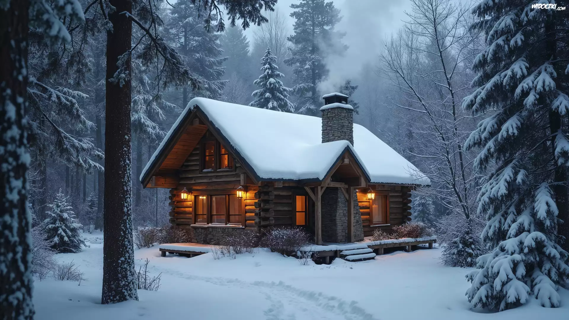Zdjęcia, Zima, Las, Drzewa, Śnieg, Ośnieżony, Dom, Oświetlony
