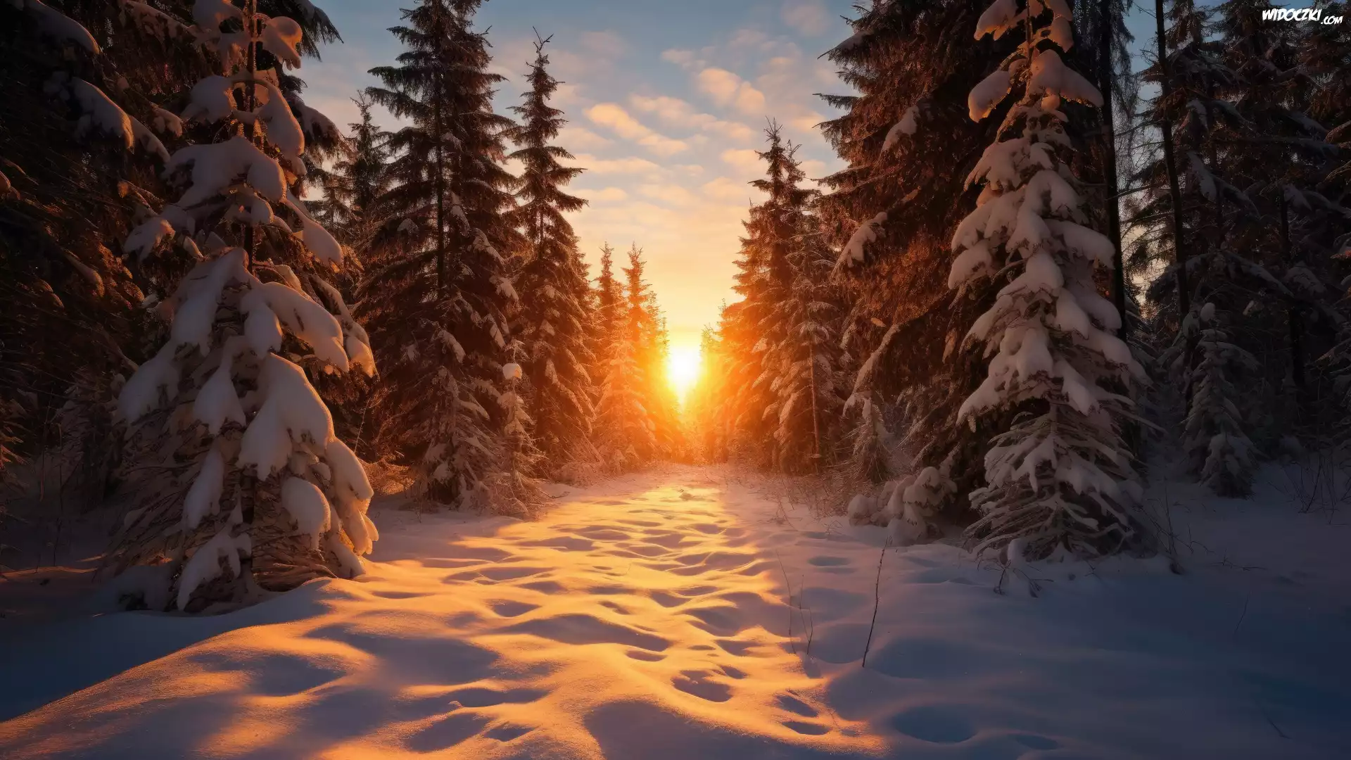 Zima, Las, Drzewa, Śnieg, Ślady, Zachód słońca