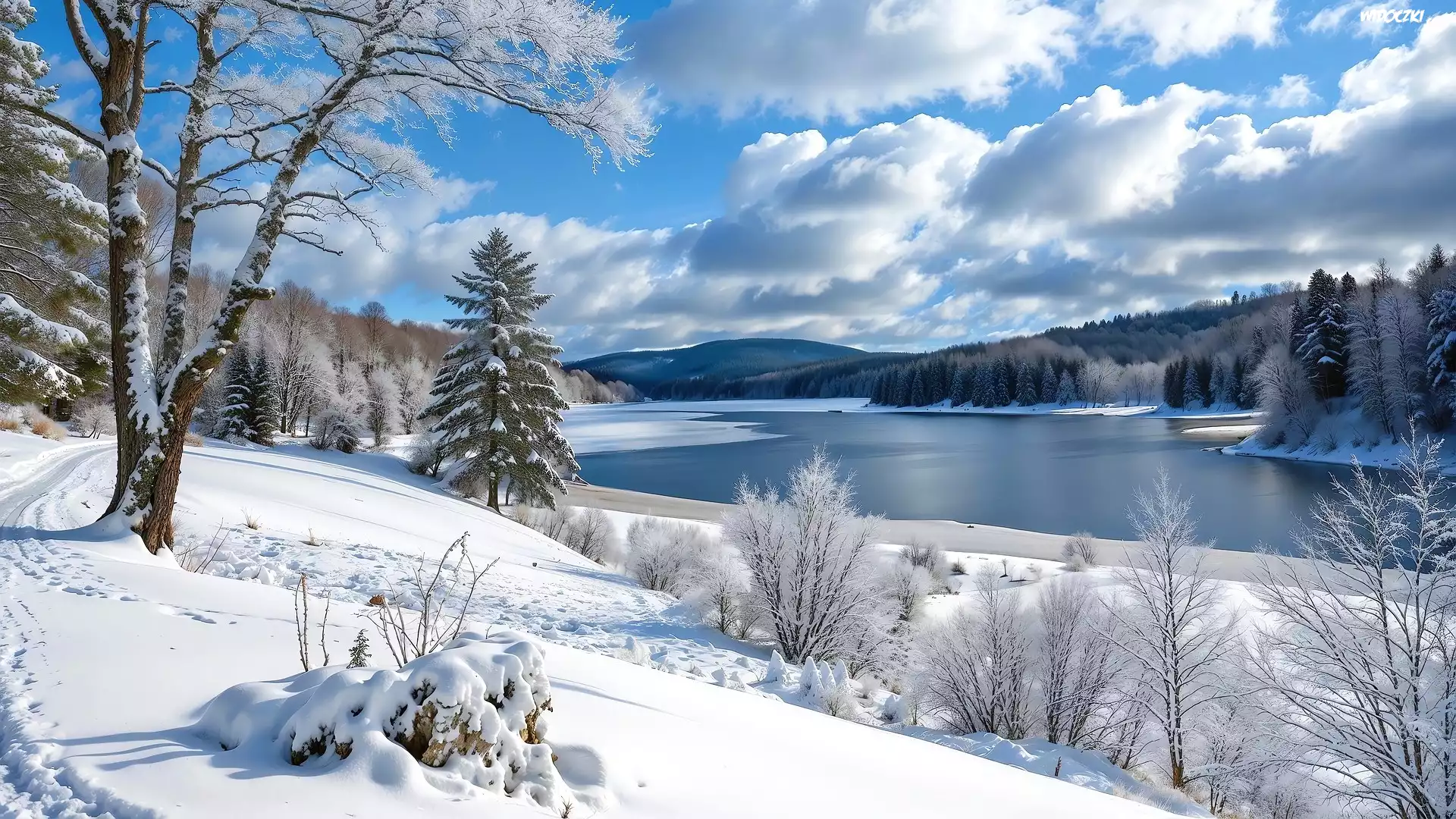 Zdjęcia, Zima, Rzeka, Drzewa, Śnieg, Droga, Grafika
