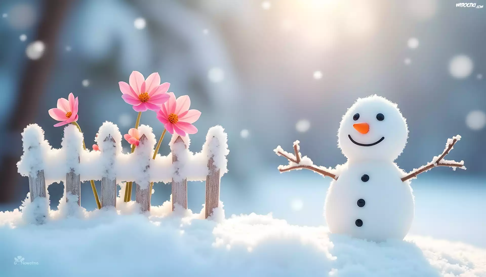 Zdjęcia, Bałwanek, Płotek, Kwiaty, Śnieg, Zima, Grafika