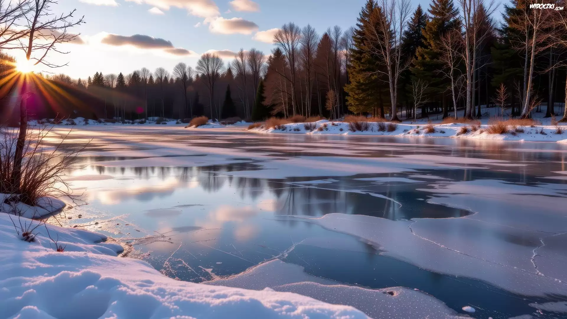 Zdjęcia, Zima, Zamarznięte, Jezioro, Śnieg, Promienie słońca, Drzewa