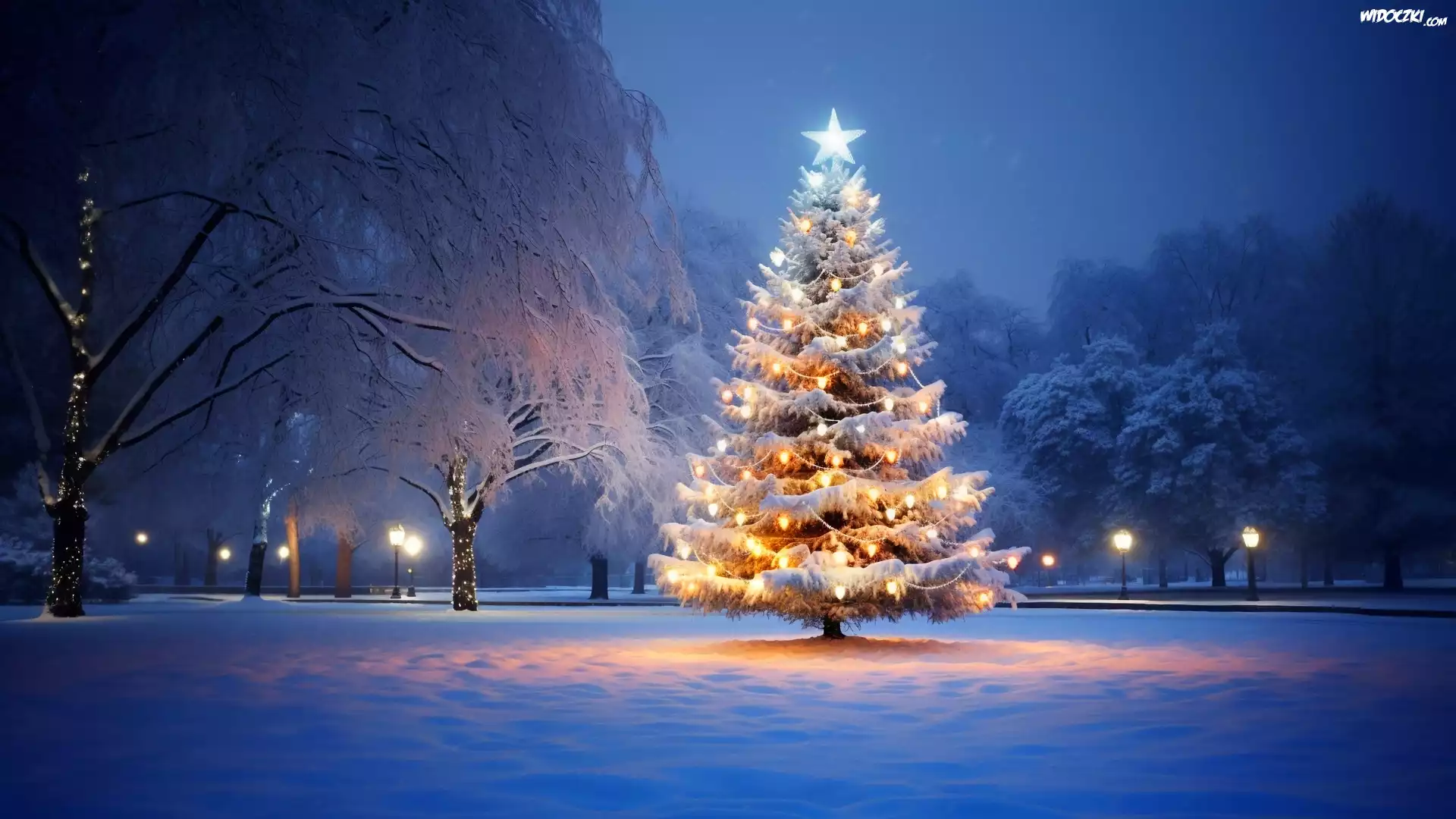 Zdjęcia, Udekorowana, Choinka, Drzewa, Śnieg, Zima, Lampy
