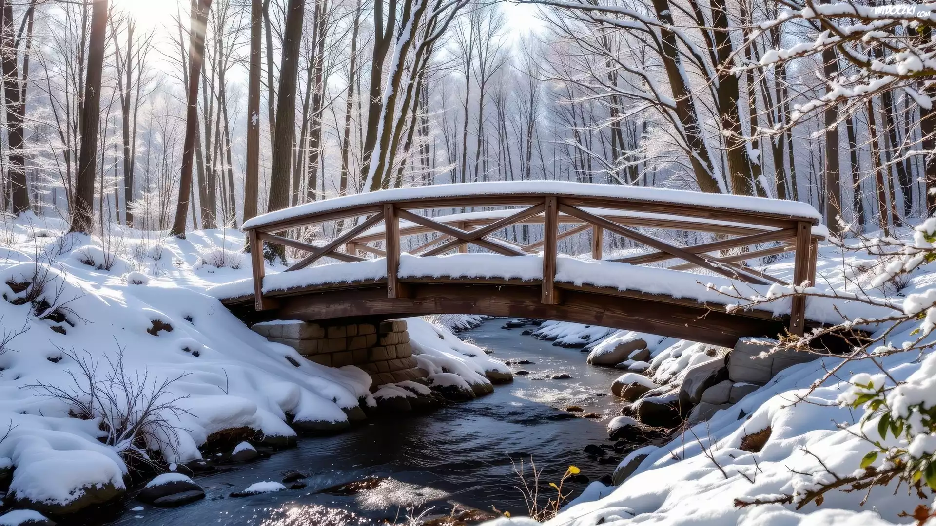 Zima, Drzewa, Las, Rzeka, Ośnieżony, Drewniany, Most, Śnieg