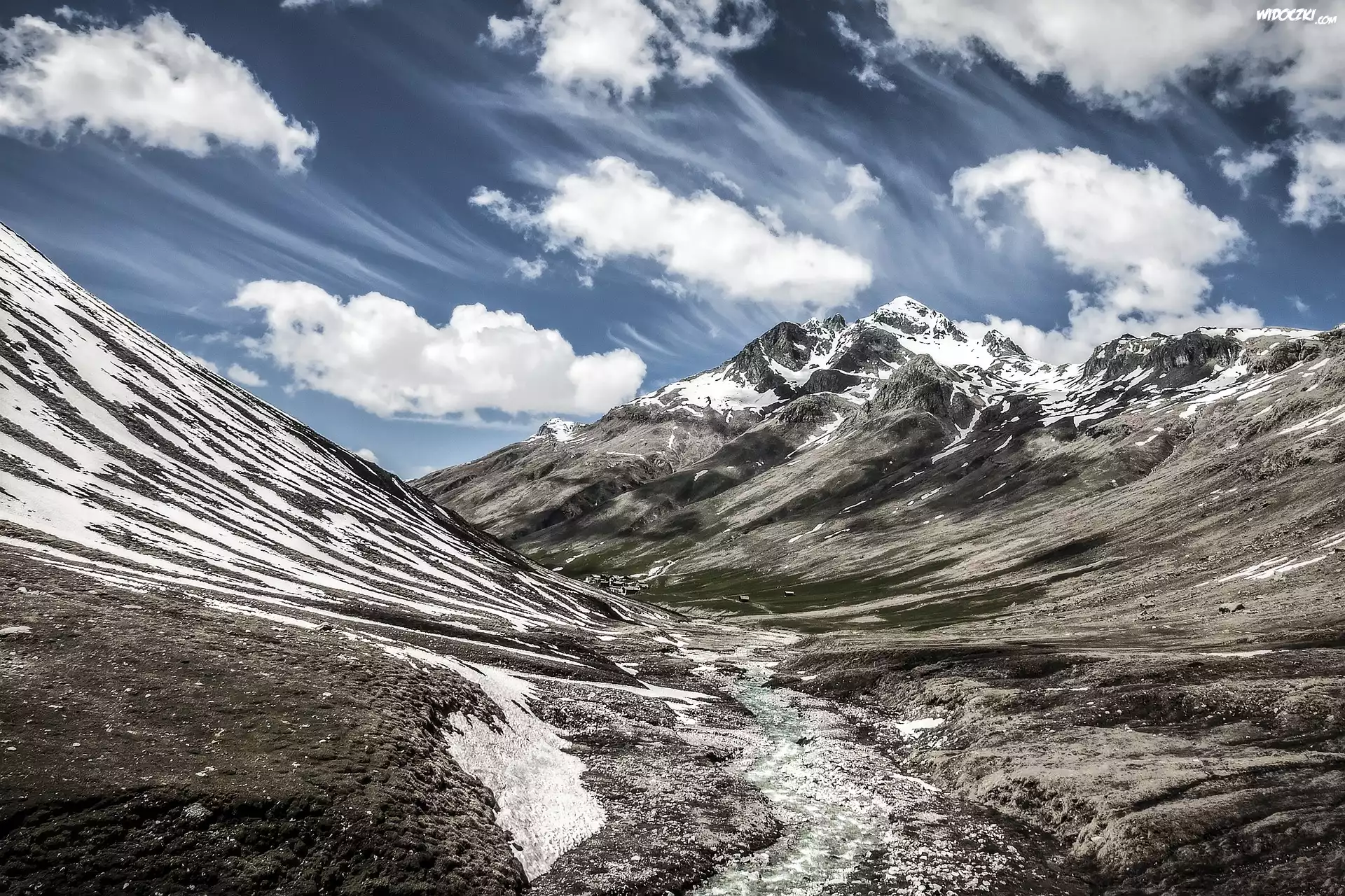 Góry, Śnieg, Rzeka, Niebo, Chmury