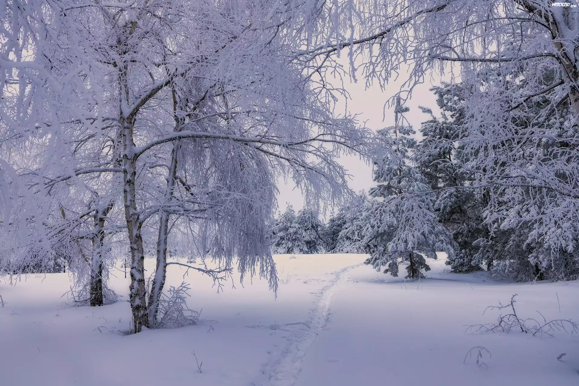Zima, Ośnieżone, Drzewa, Śnieg, Wydeptana, Ścieżka
