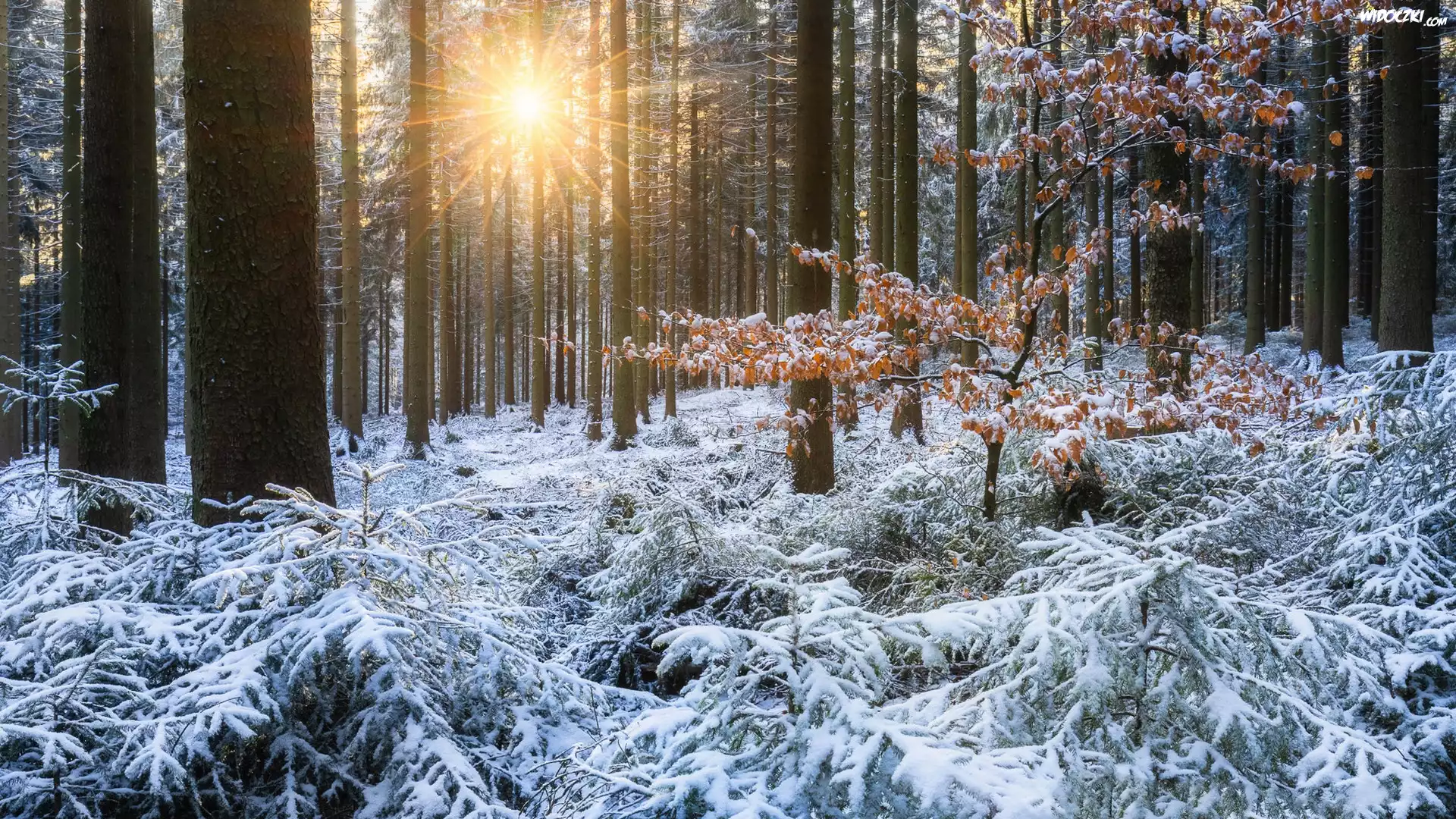 Zdjęcia, Las, Zima, Drzewa, Śnieg, Promienie słońca