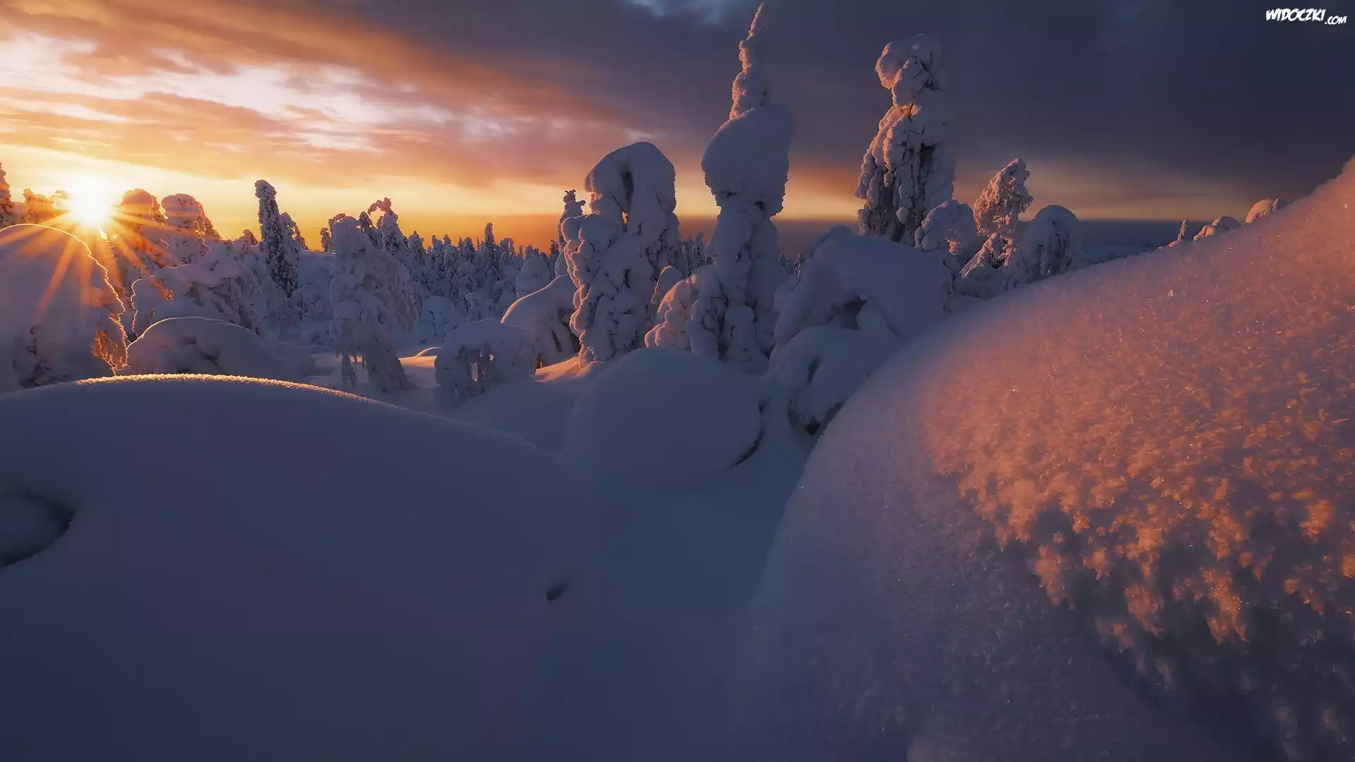 Zdjęcia, Zima, Wschód słońca, Śnieg, Ośnieżone, Drzewa, Zaspy