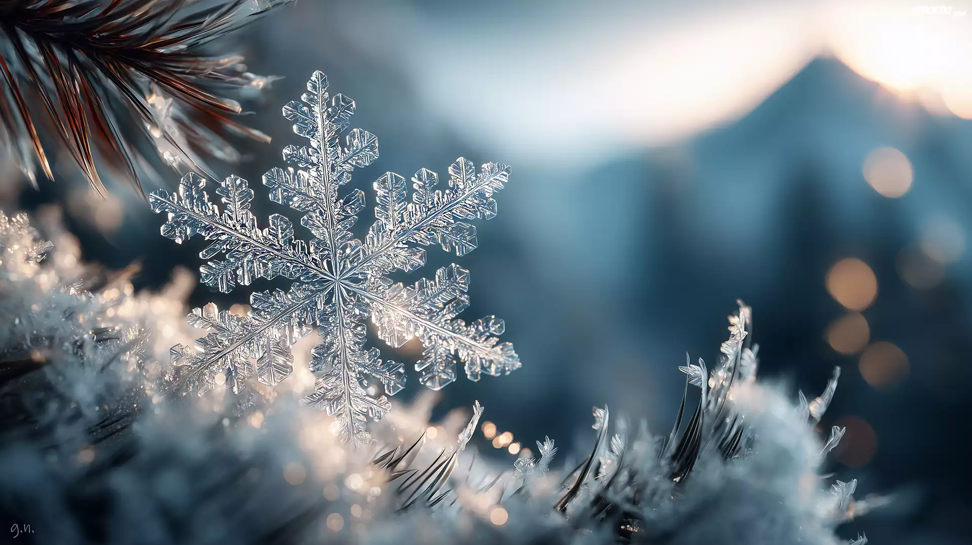 Zdjęcia, Śnieżynka, Gałązki, Sosna, Śnieg, Zima, Grafika AI