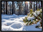 Zdjęcia, Śnieg, Gałązka, Las, Drzewa, Promienie słońca, Zima, Grafika AI