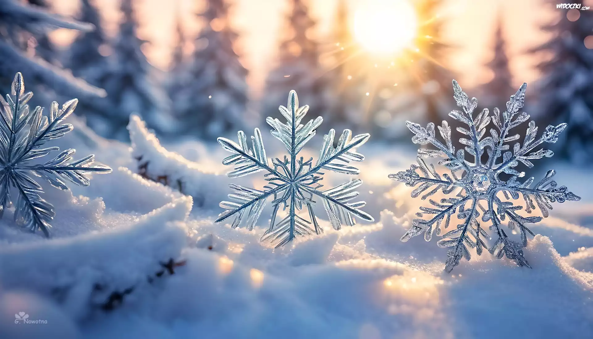 Zdjęcia, Trzy, Śnieżynki, Śnieg, Słońce, Grafika