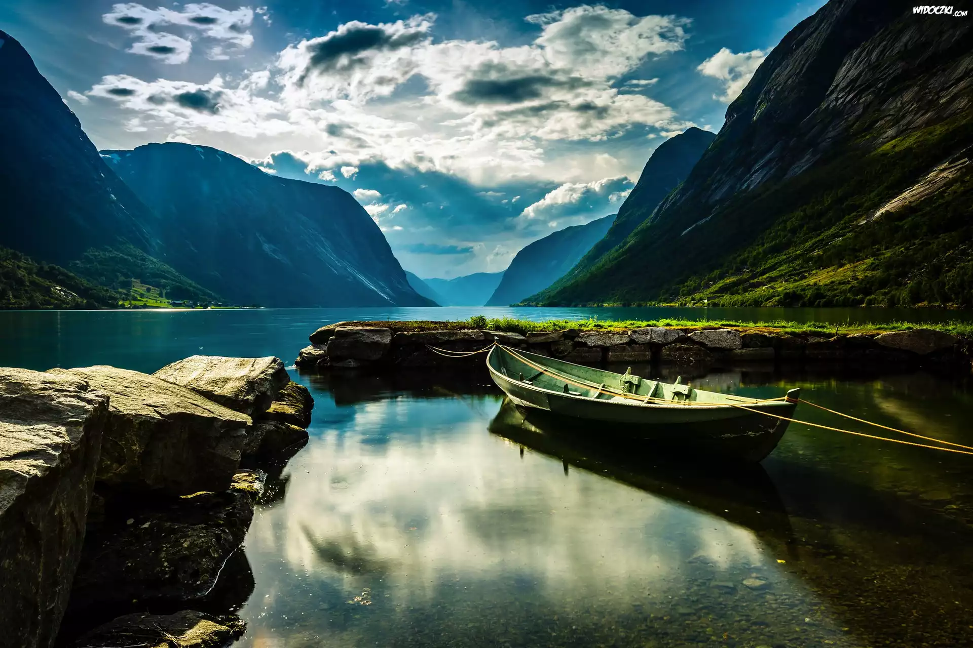 Zdjęcia, Norwegia, Sogn og Fjordane, Fiord Sognefjorden, Góry, Łódka