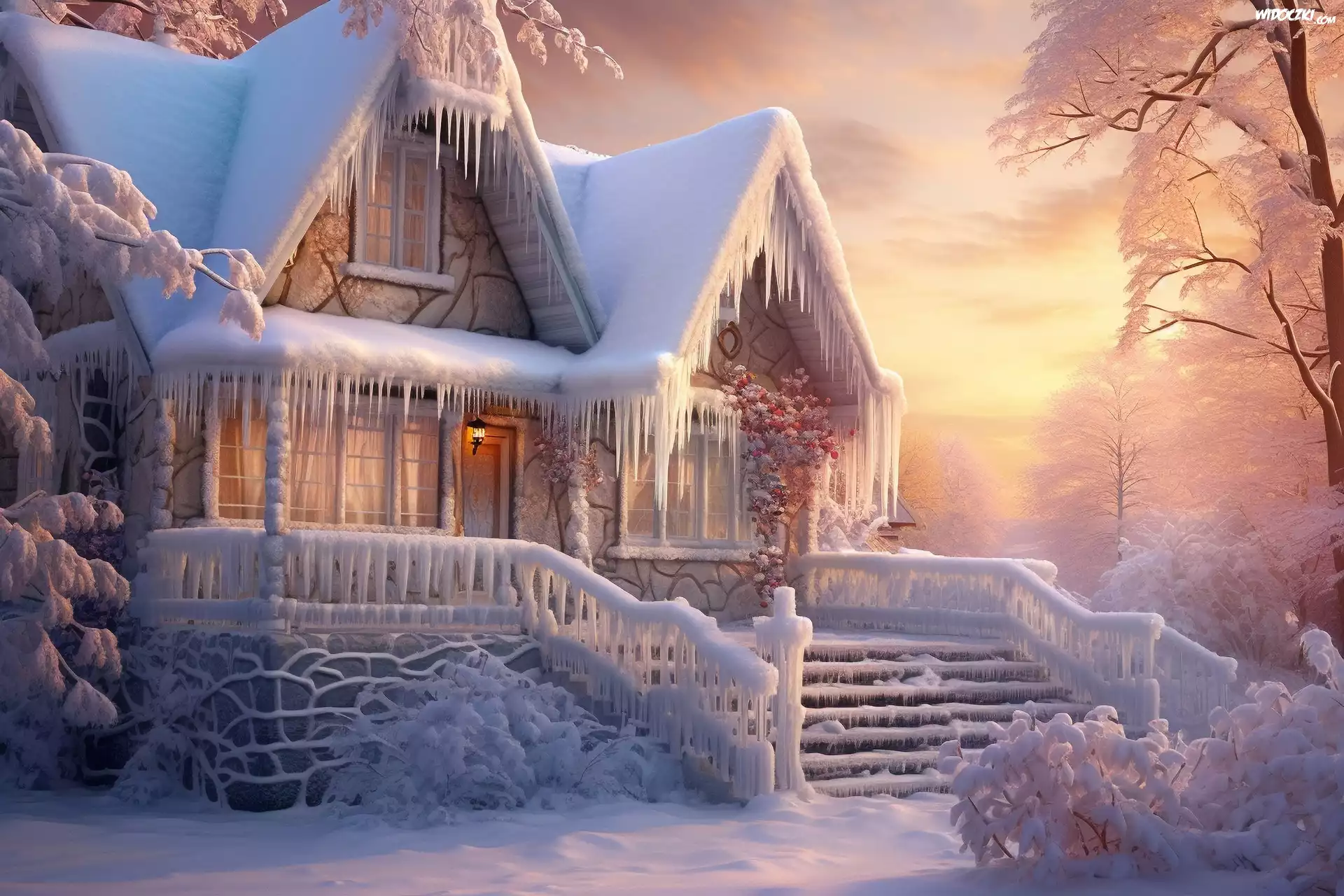 Zdjęcia, Zima, Ośnieżony, Dom, Sople, Zachód słońca, Grafika