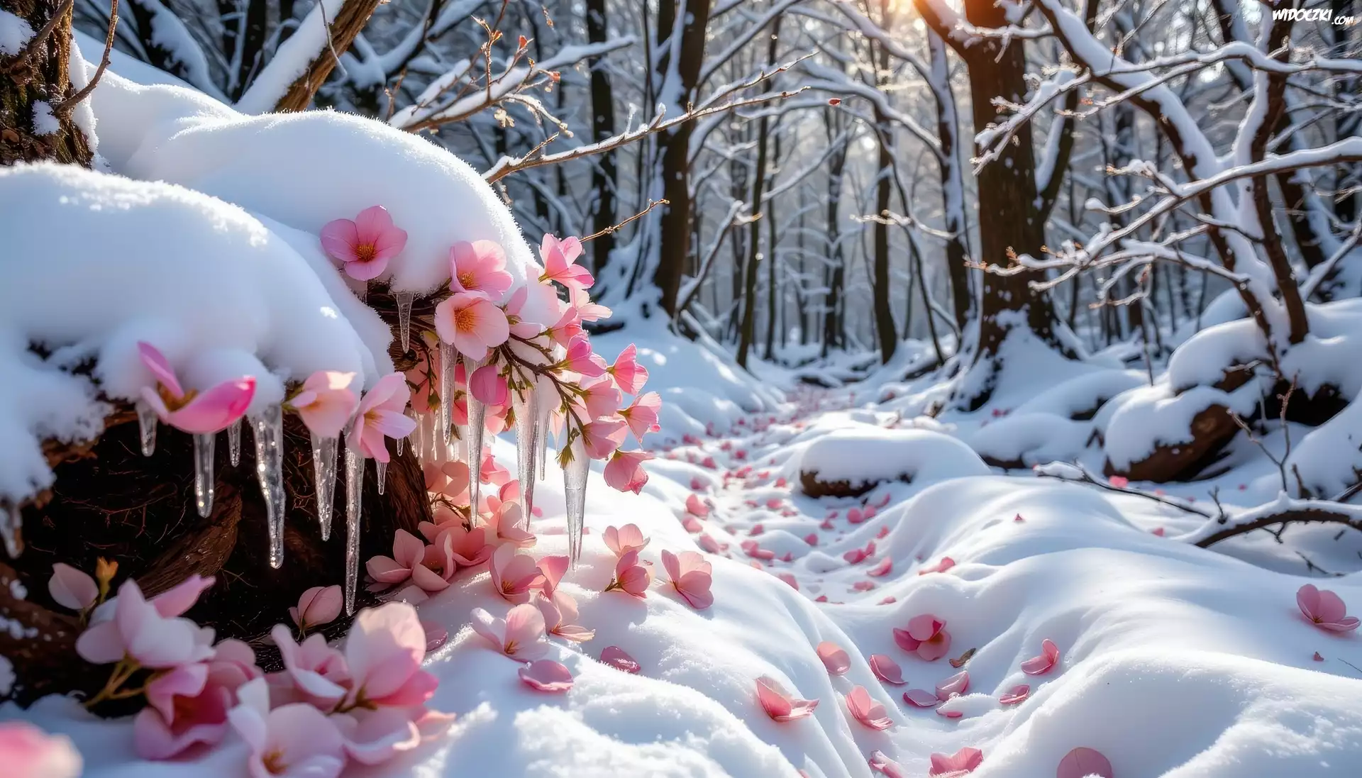 Las, Drzewa, Zima, Sople, Zaspy, Kwiaty, Różowe