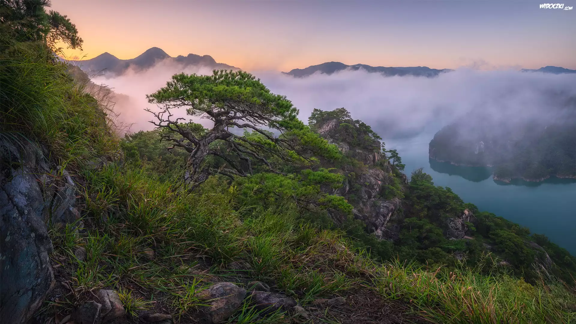 Zdjęcia, Góry, Wschód słońca, Rzeka, Mgła, Skały, Drzewa, Sosna