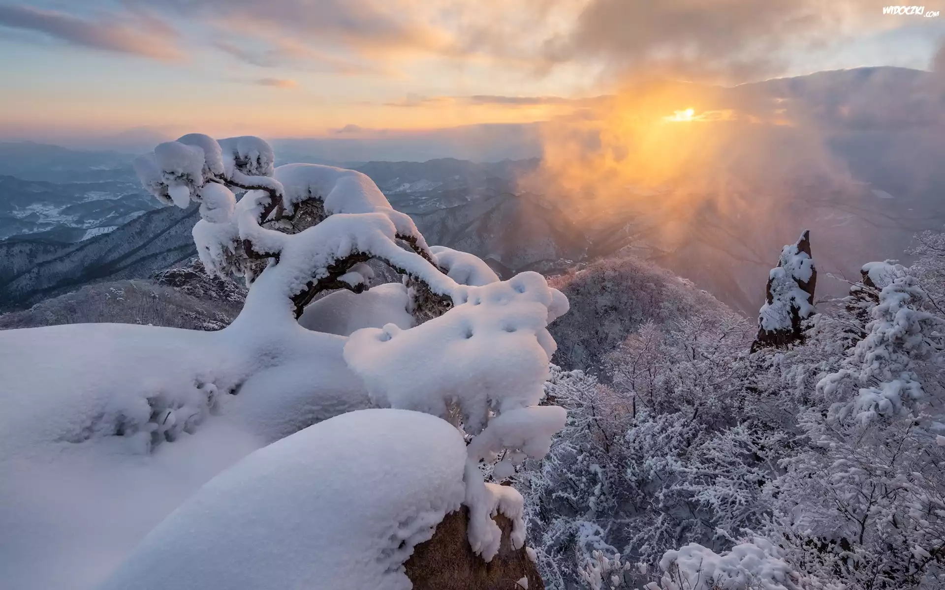 Zdjęcia, Zima, Góry, Zaśnieżona, Sosna, Drzewa, Zachód słońca
