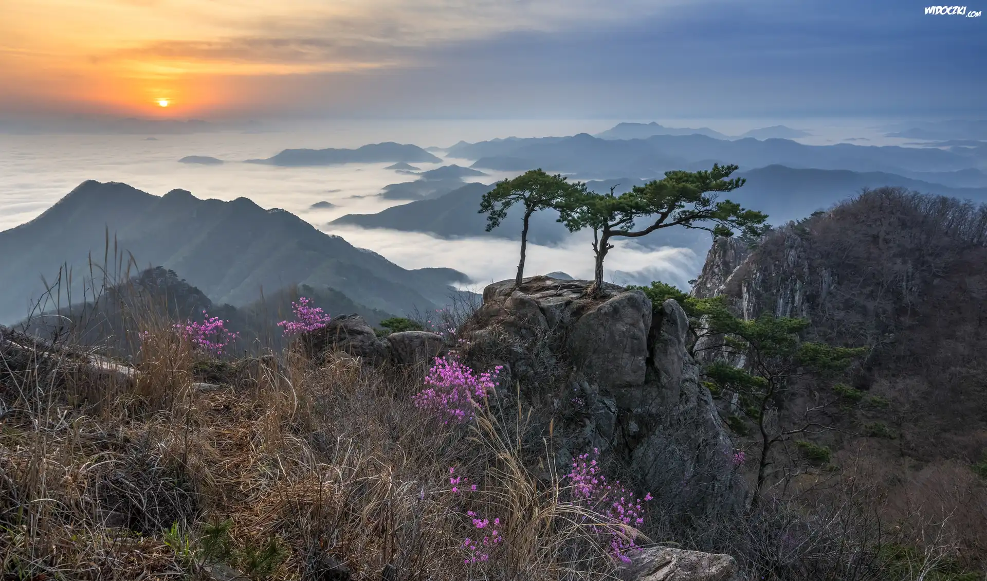 Zdjęcia, Góry, Sosny, Skała, Kwiaty, Mgła, Wschód słońca