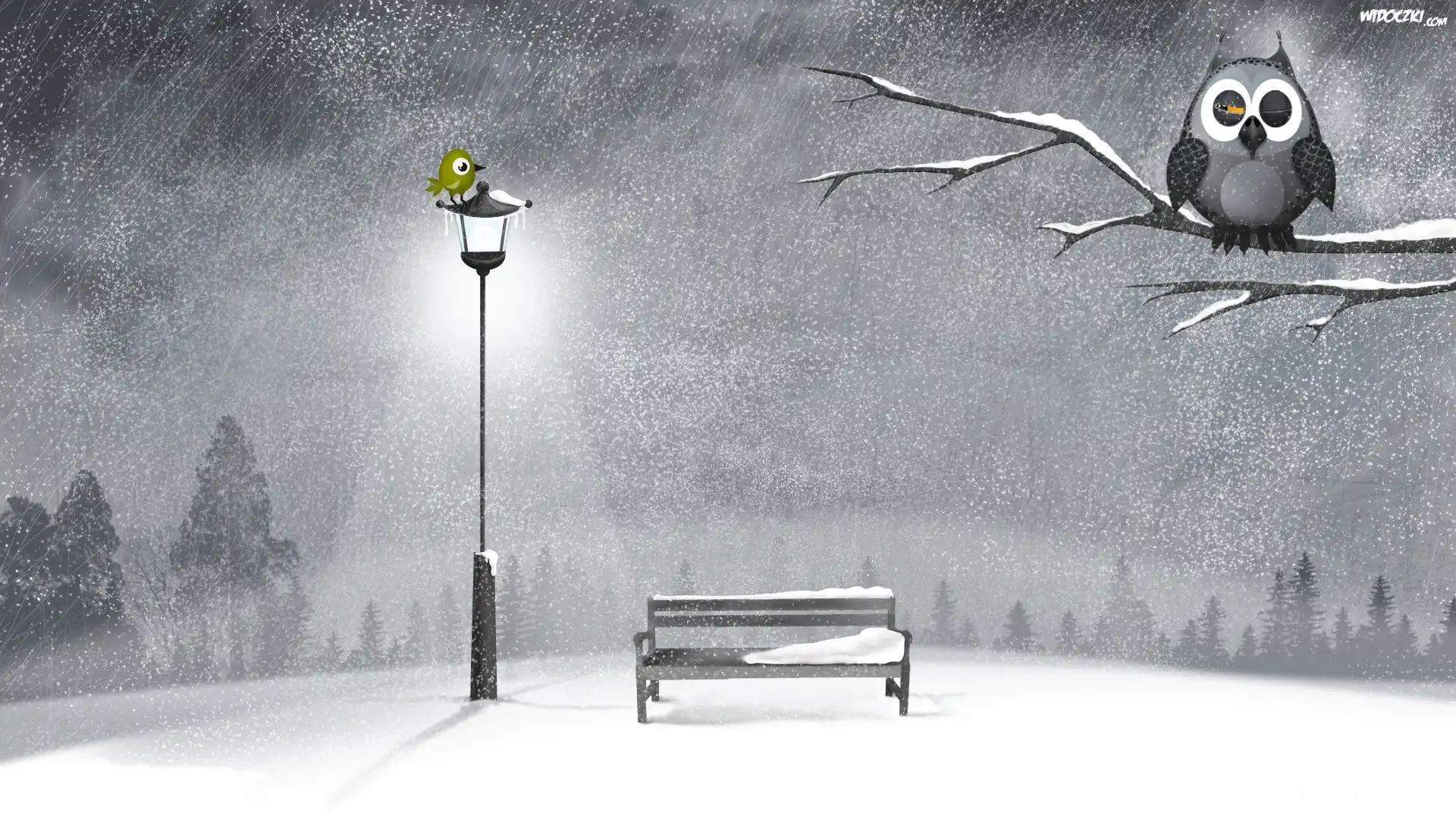 Zdjęcia, Sowa, Latarnia, Ławka, Zima, Grafika