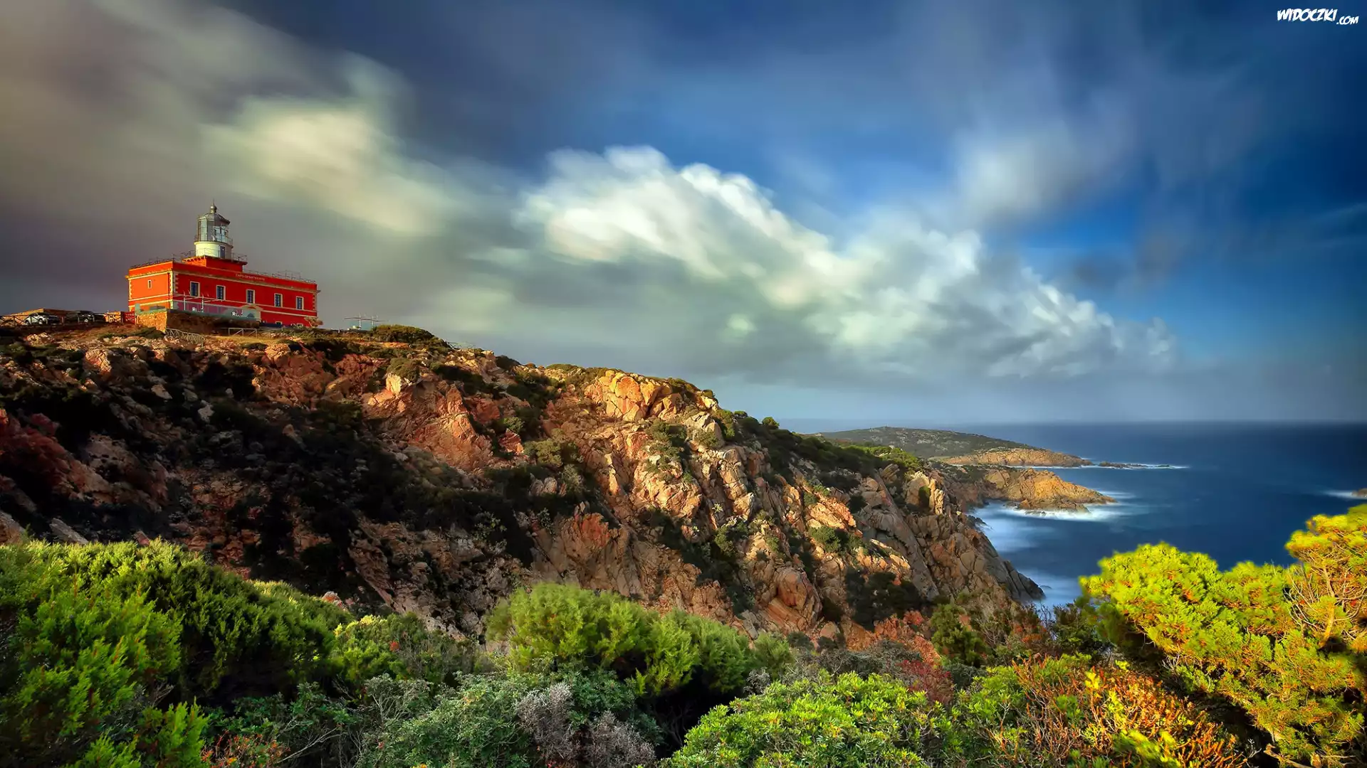 Morze Śródziemne, Chmury, Wybrzeże, Skały, Drzewa, Latarnia morska, Capo Spartivento, Sardynia, Włochy |