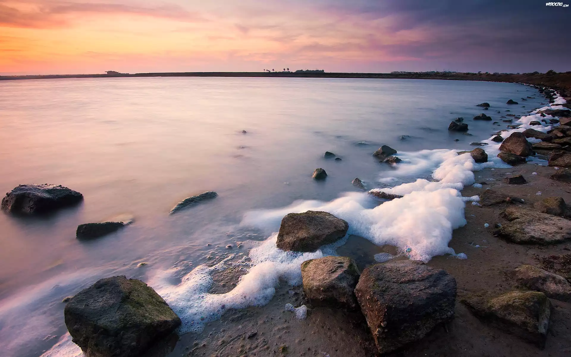 Zdjęcia, Spieniona, Woda, Kamienie, Zachód, Słońca
