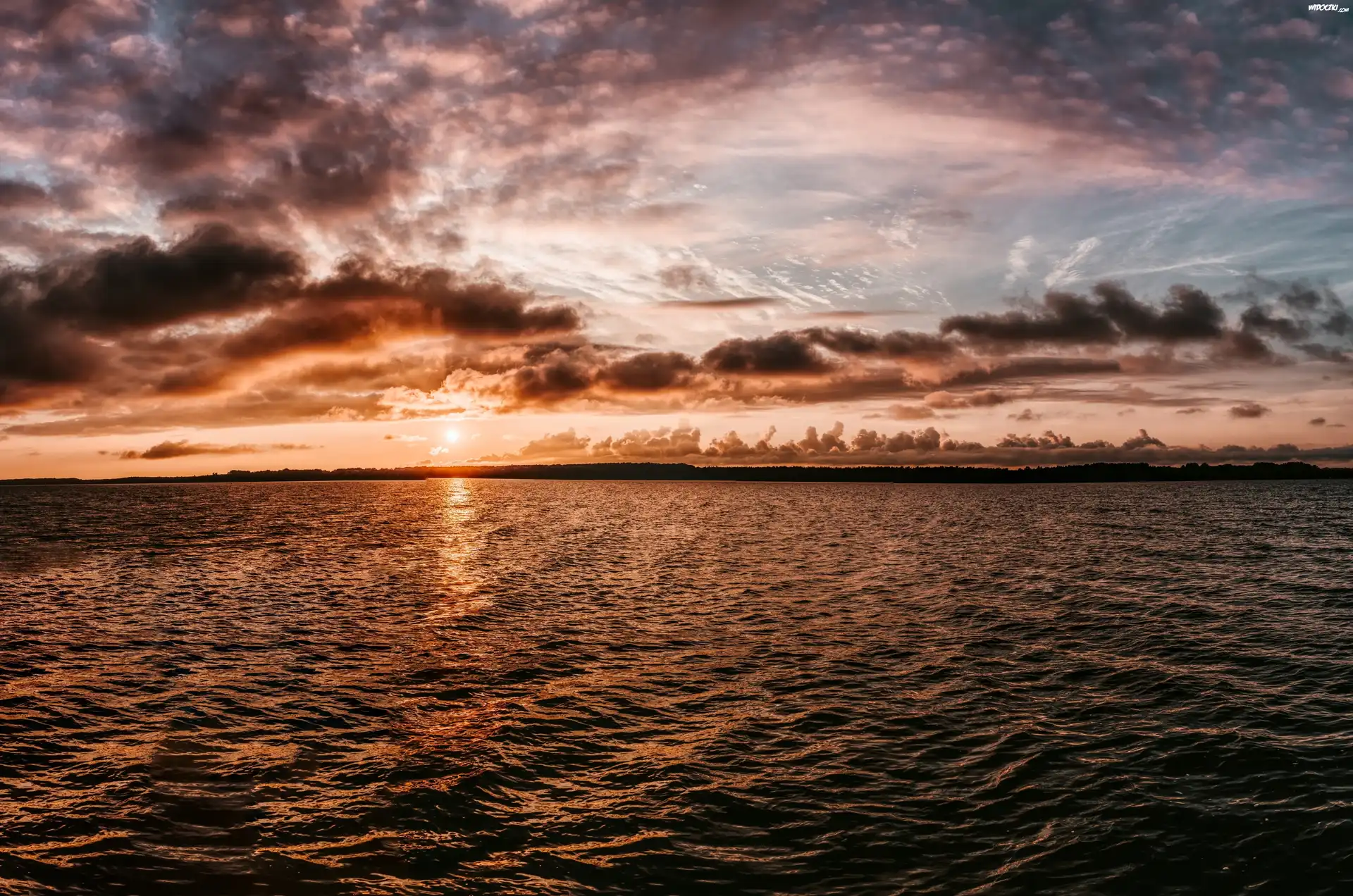 Spokojne, Morze, Zachód słońca, Chmury
