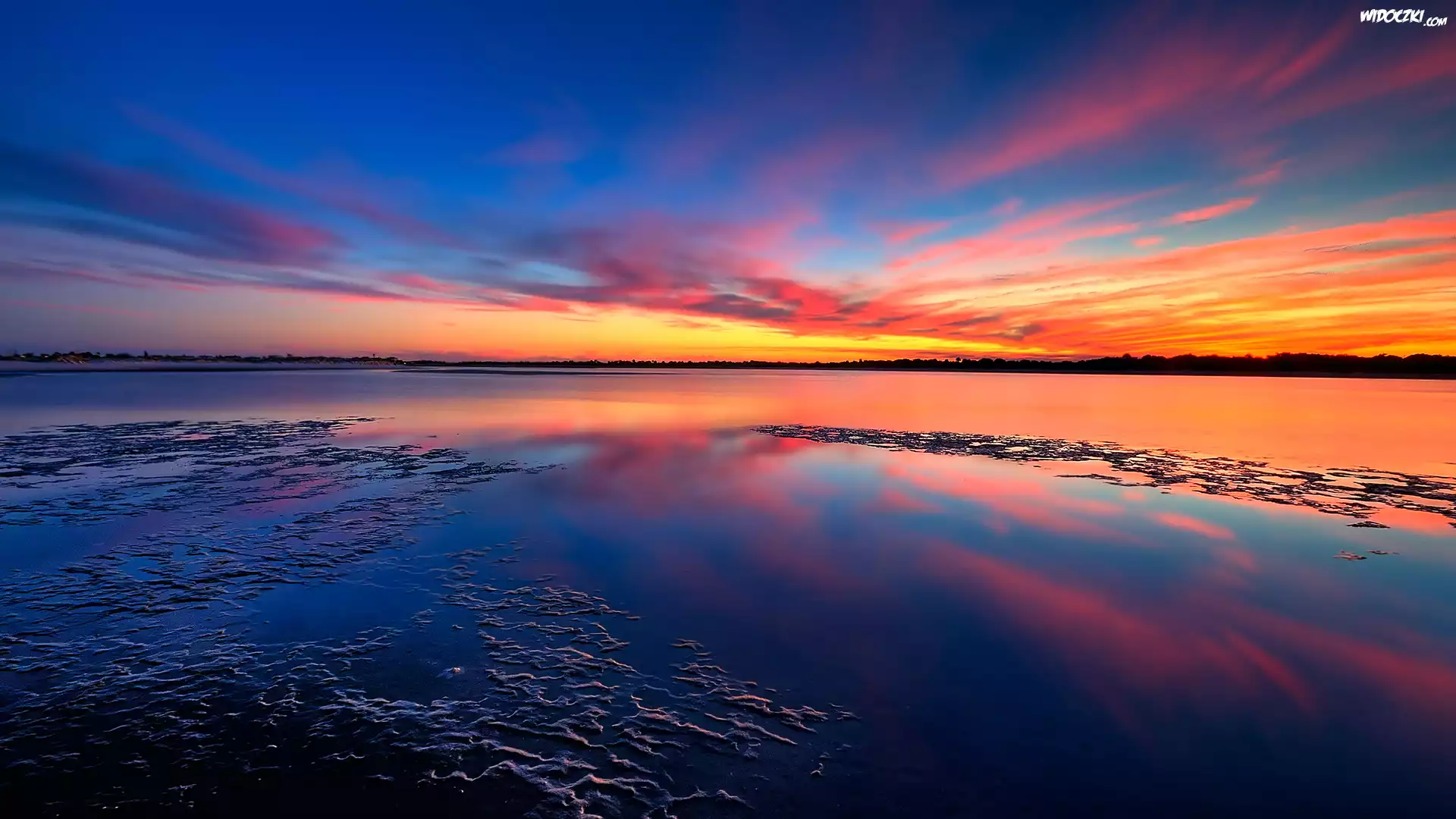 Spokojne, Jezioro, Niebo, Zachodzące, Słońce
