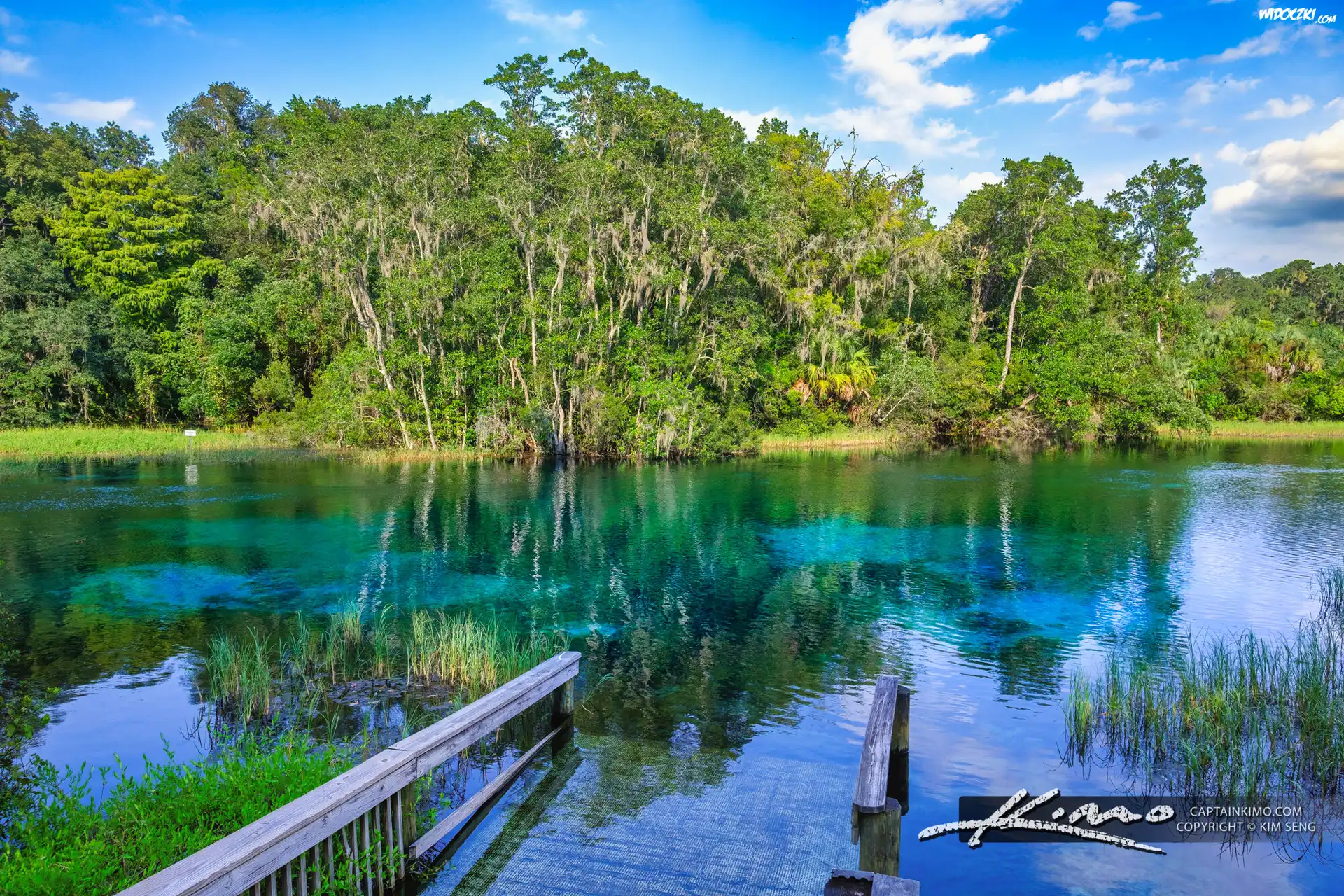 Zdjęcia, Stany Zjednoczone, Floryda, Park Stanowy Rainbow Springs, Jezioro, Pomost, Szuwary, Drzewa