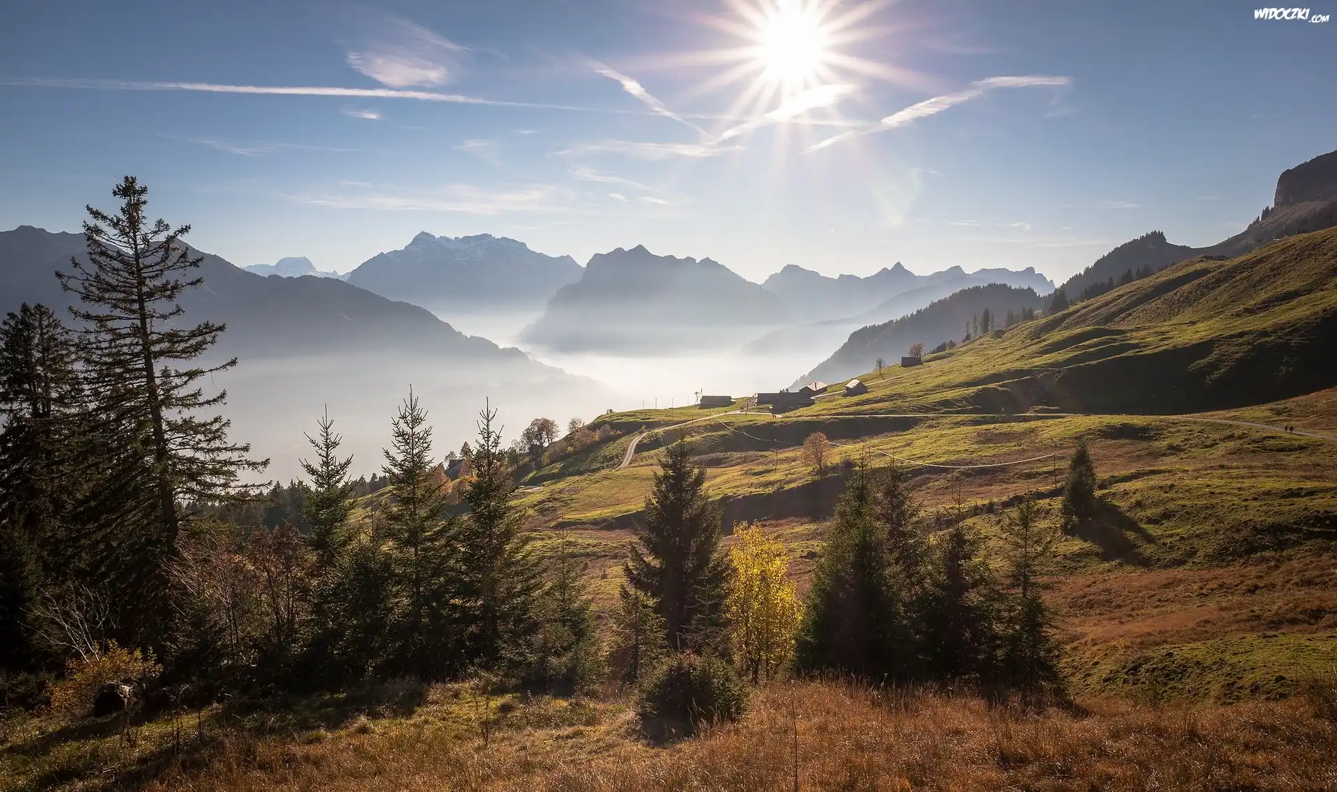 Zdjęcia, Szwajcaria, Kanton St. Gallen, Góry Alpy, Mgła, Promienie słońca, Drogi, Domy