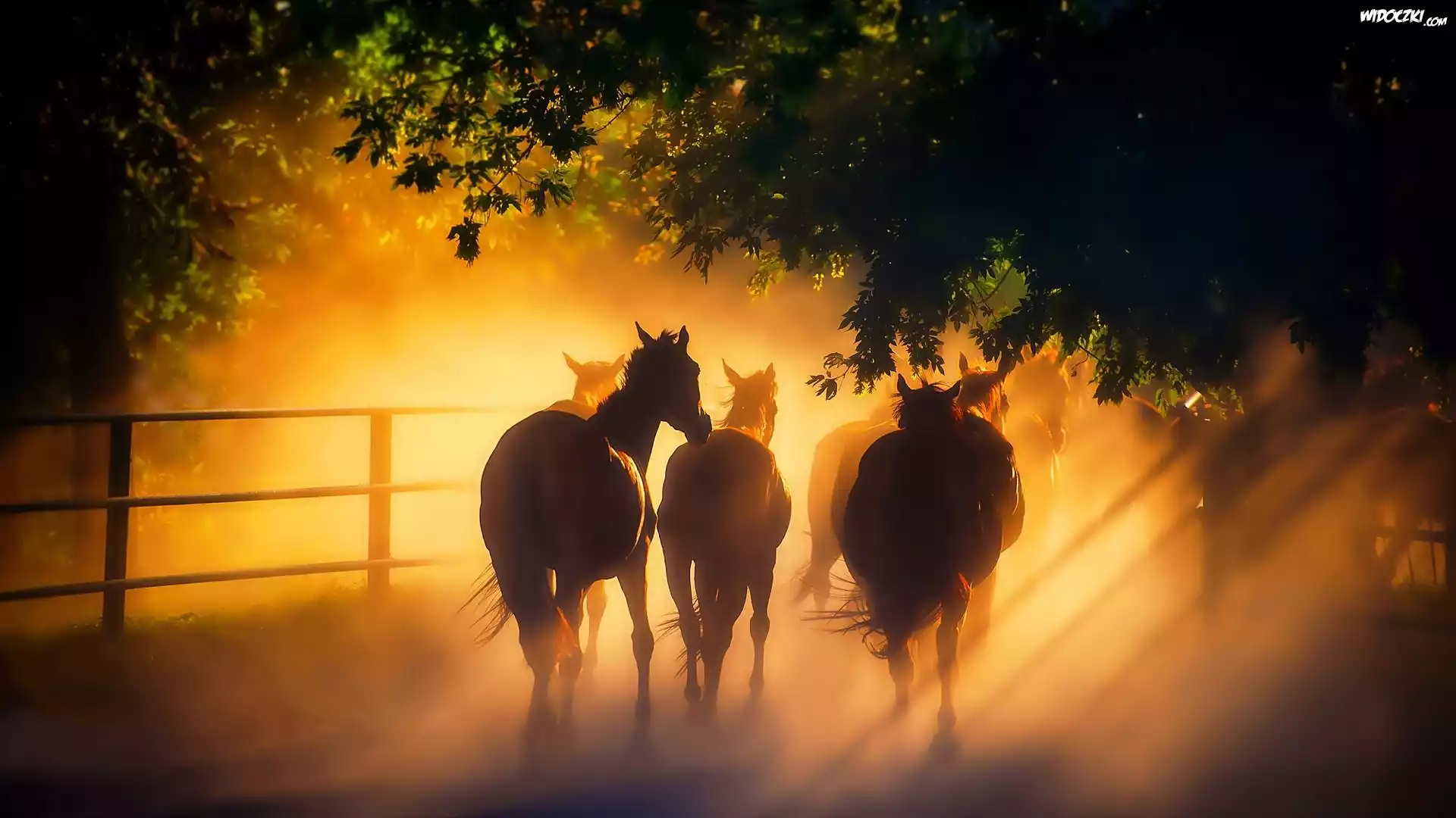 Zdj臋cia, Stado, Koni, We, Mgle, Droga, Drzewa