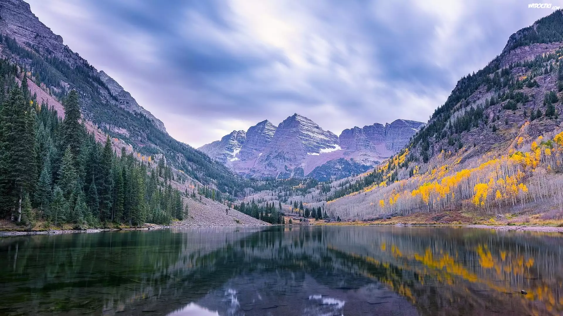 Zdjęcia, Stany Zjednoczone, Stan Kolorado, Góry, Szczyty Maroon Bells, Jezioro Maroon, Drzewa