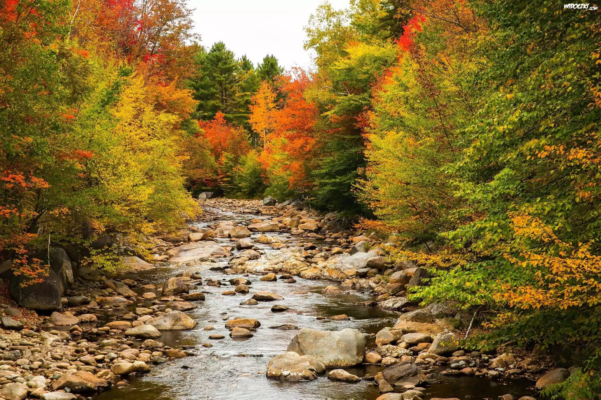 Zdjęcia, Stany Zjednoczone, Stan New Hampshire, Rzeka Pemigewasset River, Kamienie, Las, Jesień