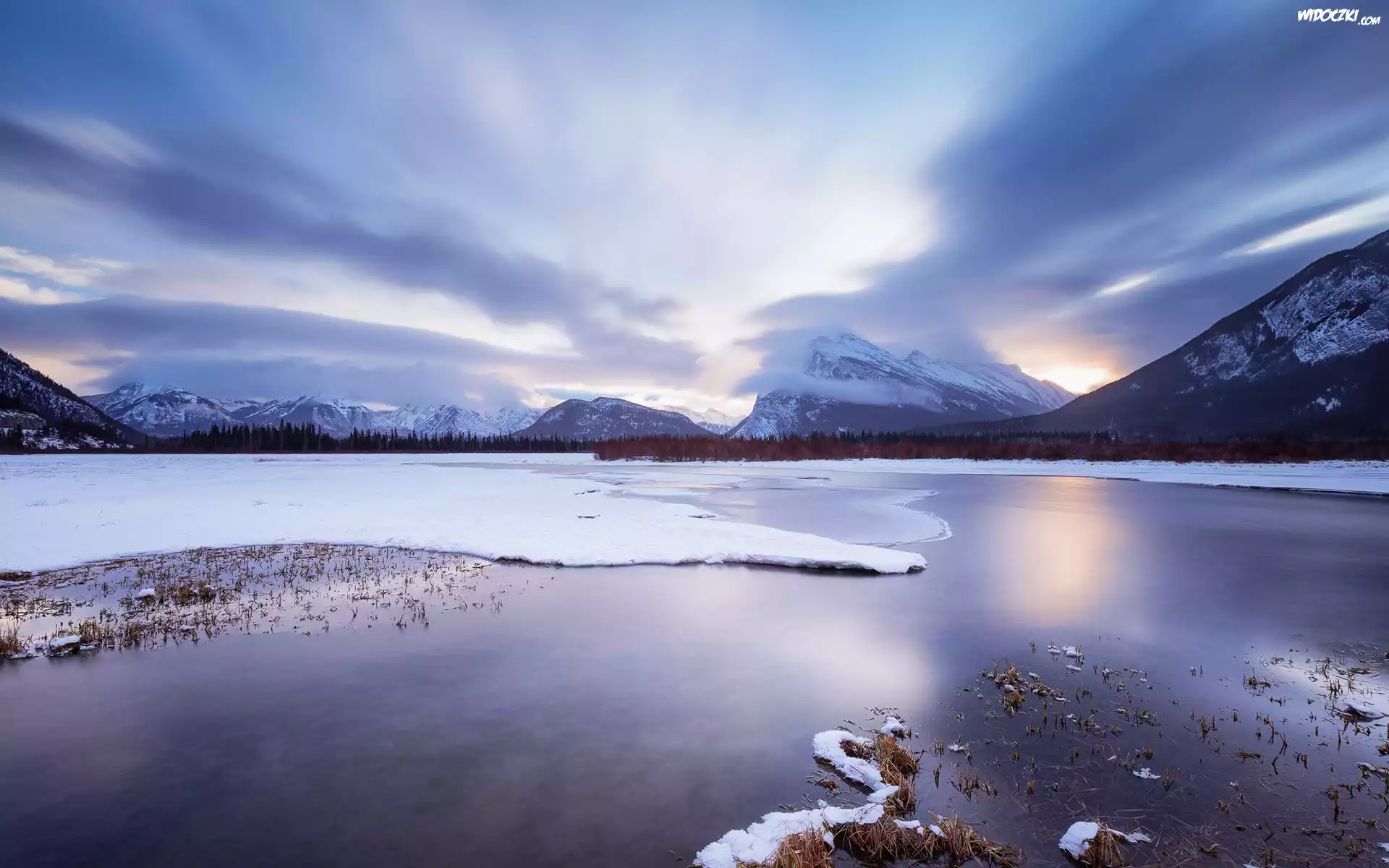 Zdjęcia, Stany Zjednoczone, Stan Minnesota, Jezioro Vermilion, Śnieg, Chmury, Góry, Wschód słońca
