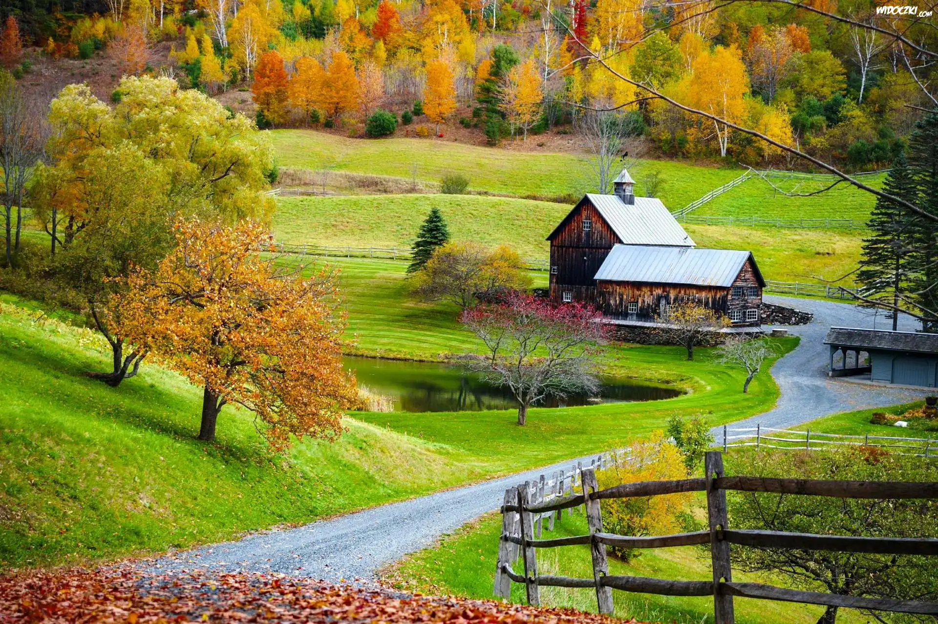 Zdjęcia, Stany Zjednoczone, Stan Vermont, Nowa Anglia, Jesień, Drzewa, Staw, Dom, Droga