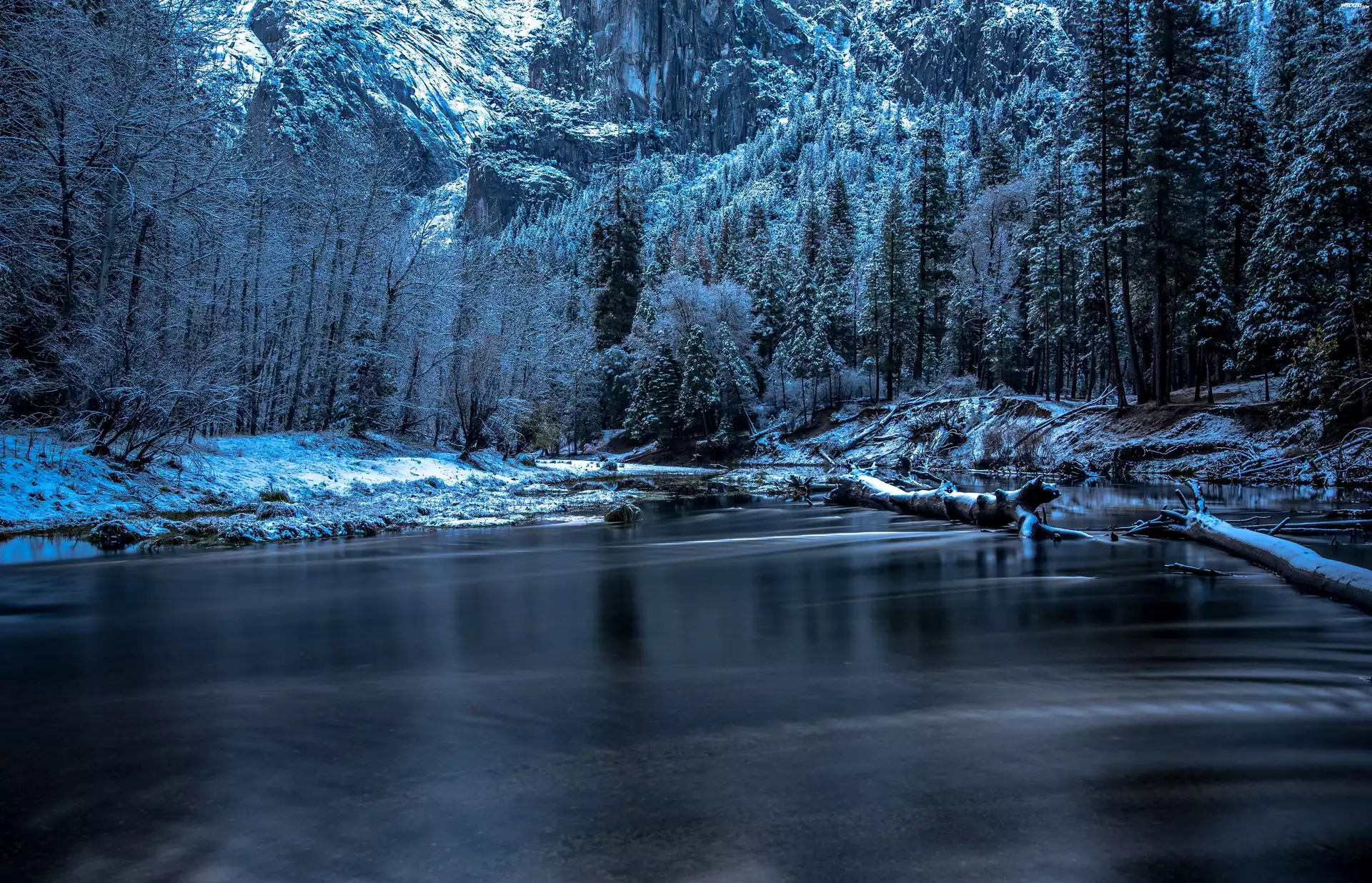 Zdjęcia, Stany Zjednoczone, Stan Kalifornia, Park Narodowy Yosemite, Zima, Góry, Rzeka, Drzewa