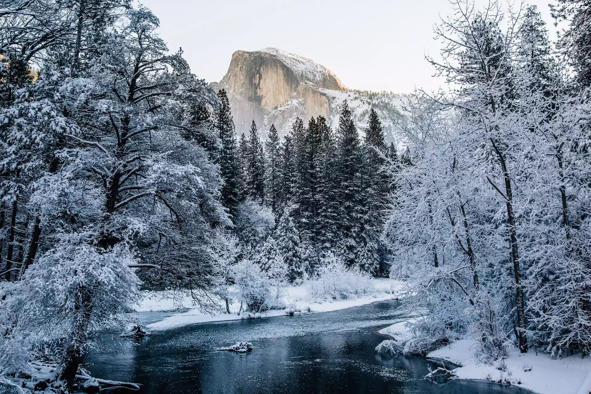 Zdjęcia, Stany Zjednoczone, Stan Kalifornia, Park Narodowy Yosemite, Zima, Las, Rzeka, Góry