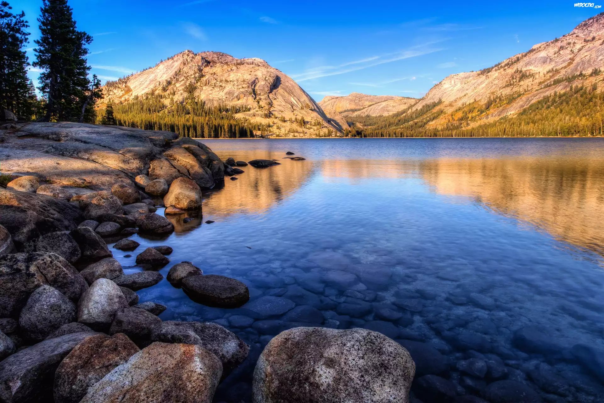 Zdjęcia, Stany Zjednoczone, Stan Kalifornia, Park Narodowy Yosemite, Góry, Jezioro Tenaya, Kamienie