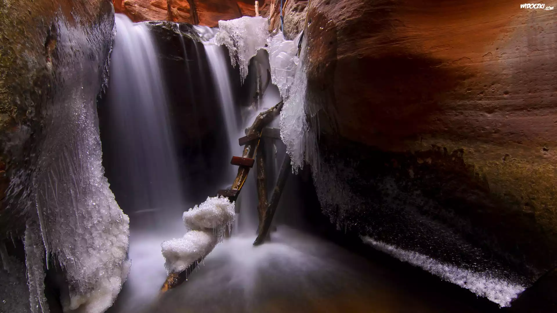Zdjęcia, Stany Zjednoczone, Stan Utah, Park Narodowy Zion, Kanion, Sople, Lód, Wodospad