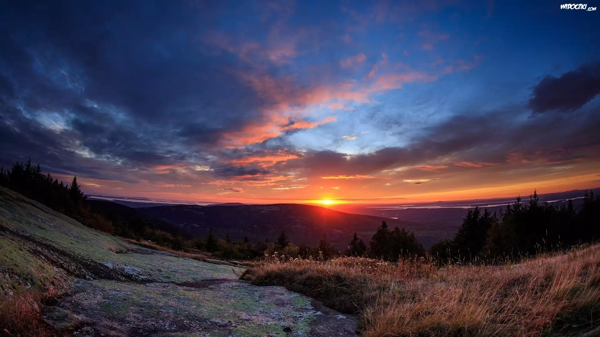 Stany Zjednoczone, Stan Maine, Park Narodowy Acadia, Zachód słońca, Drzewa, Wzgórza