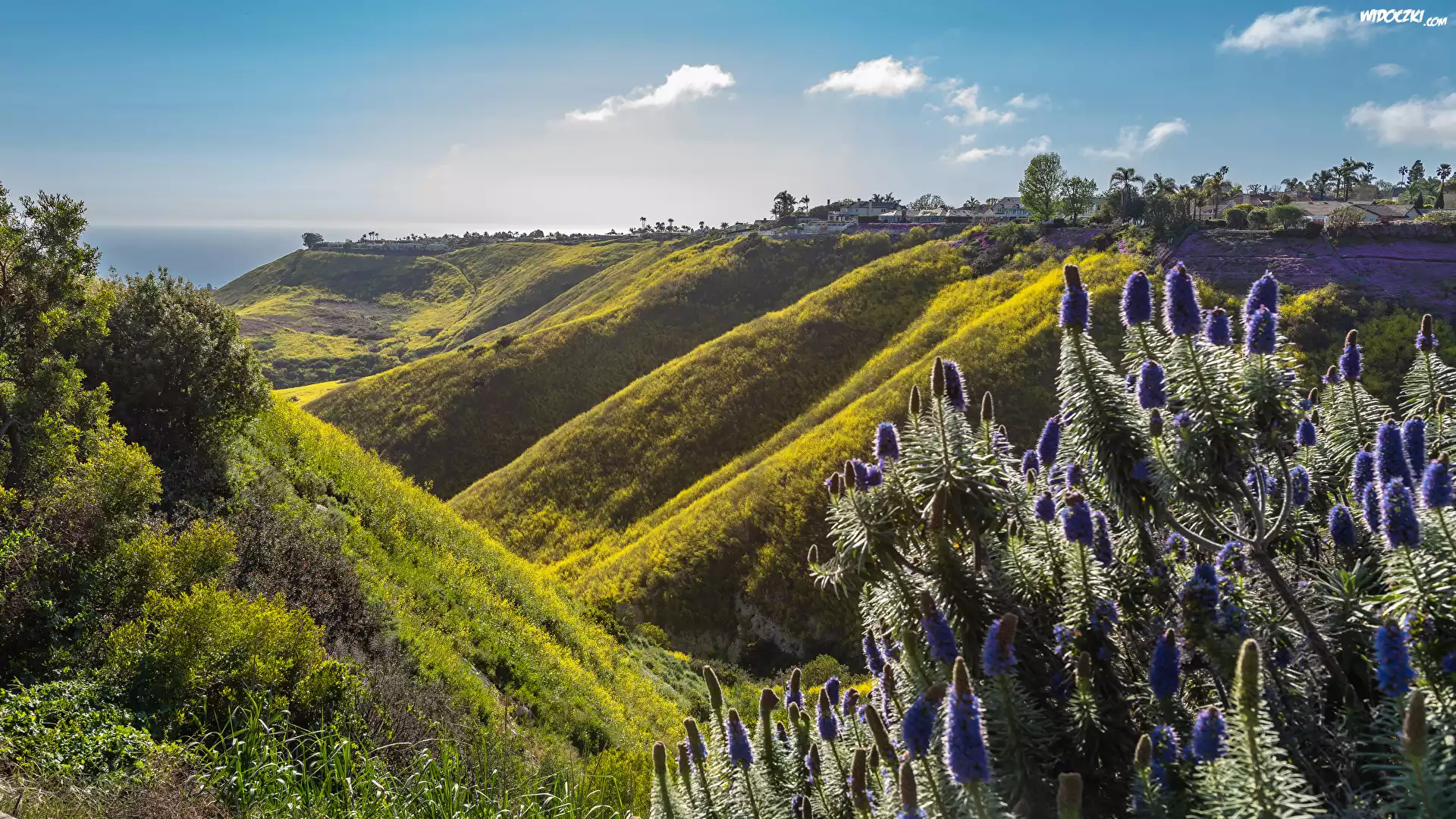 Zdjęcia, Stany Zjednoczone, Stan Kalifornia, Rancho Palos Verdes, Wzgórza, Dolina, Fioletowe, Kwiaty