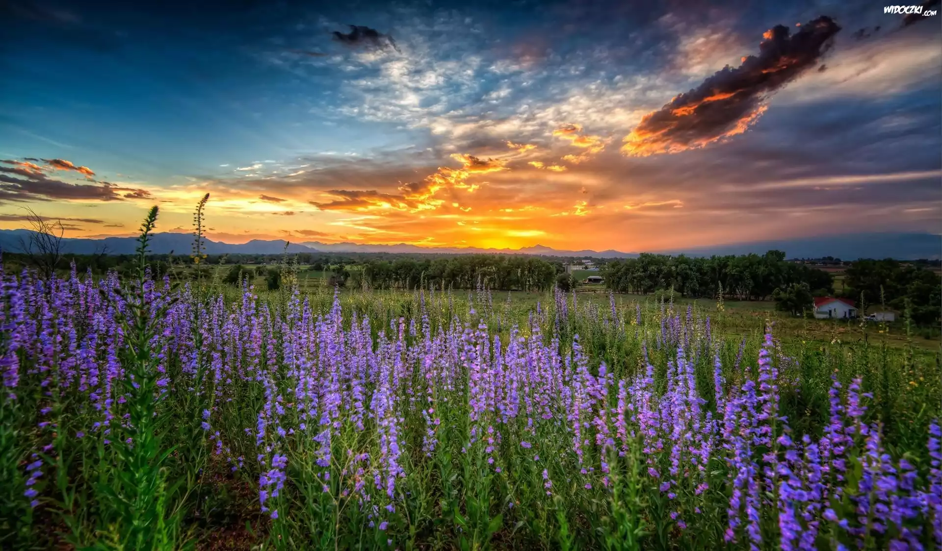 Zdjęcia, Stany Zjednoczone, Stan Kolorado, Szlak Louisville-Lafayette, Łąka, Kwiaty, Zachód słońca