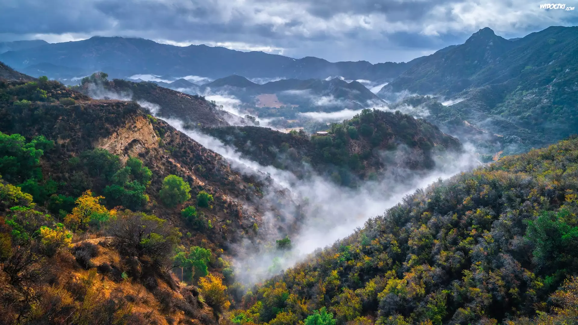 Stany Zjednoczone, Kalifornia, Park stanowy Malibu Creek, Trawy, Góry Santa Monica, Wąwóz, Mgła, Roślinność |