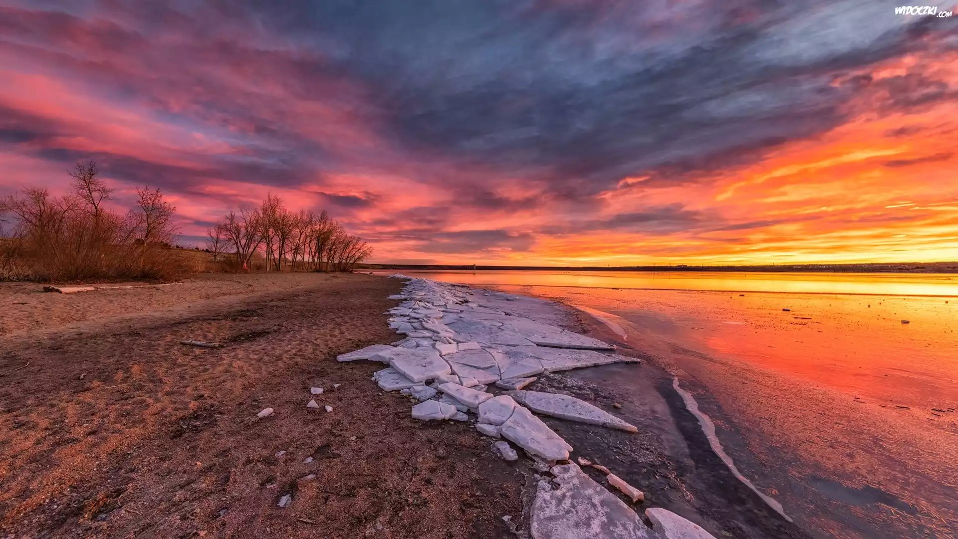Stany Zjednoczone, Kolorado, Park stanowy, Chatfield State Park, Drzewa, Jezioro, Chatfield Lake, Zachód słońca |