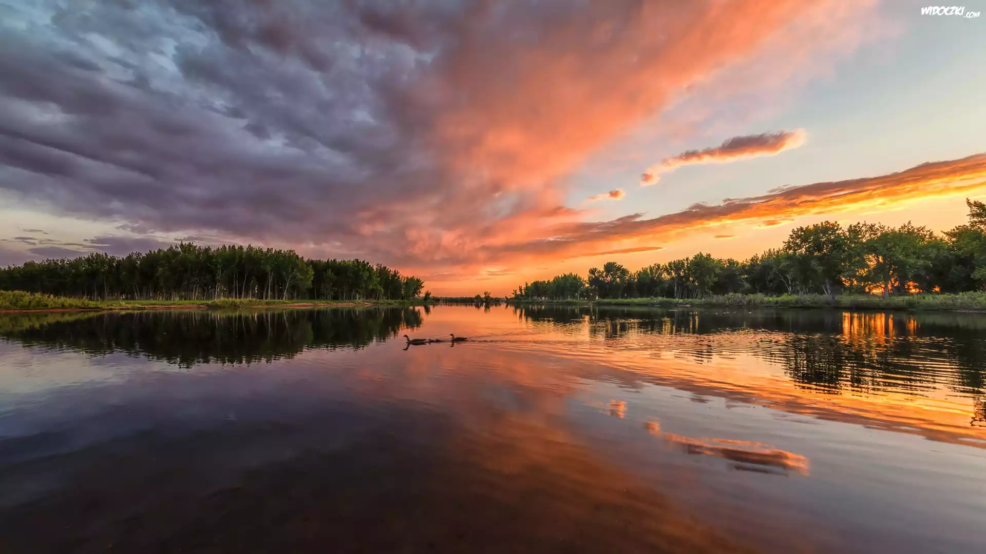 Stany Zjednoczone, Kolorado, Park stanowy, Chatfield State Park, Jezioro, Chatfield Lake, Drzewa, Zachód słońca |