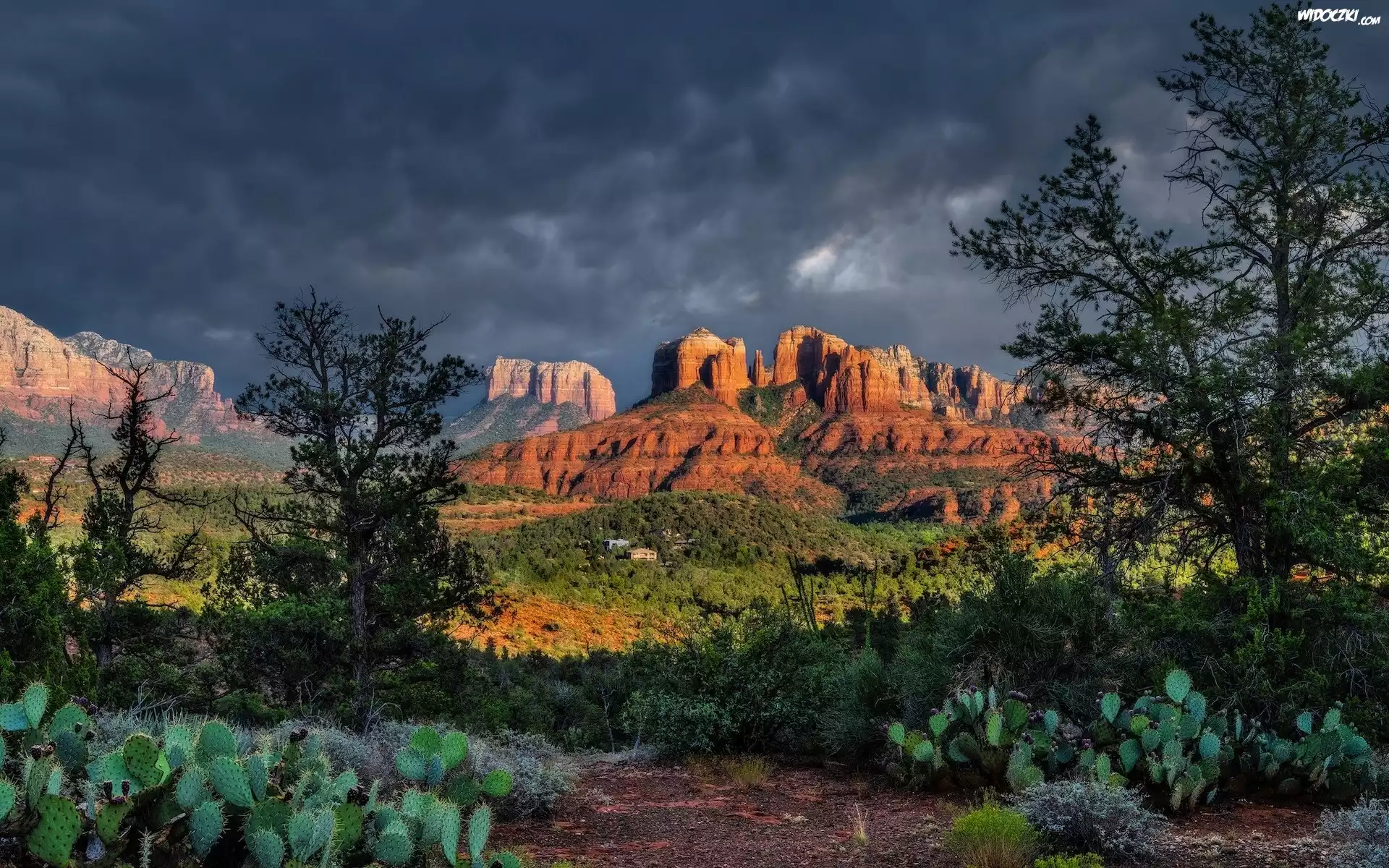 Stany Zjednoczone, Arizona, Sedona, Skały, Cathedral Rock, Drzewa, Chmury, Kaktusy