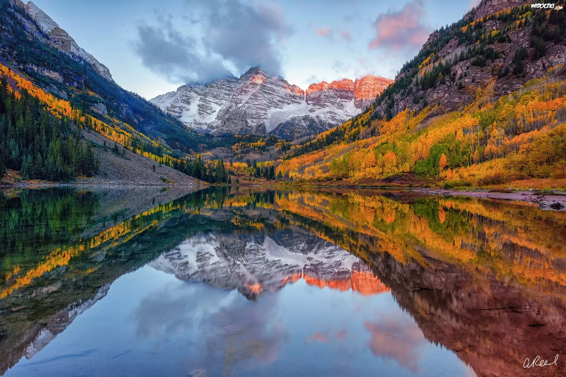 Stany Zjednoczone, Stan Kolorado, Góry Skaliste, Szczyty Maroon Bells, Jezioro Maroon Lake, Jesień, Drzewa, Chmury, Odbicie |