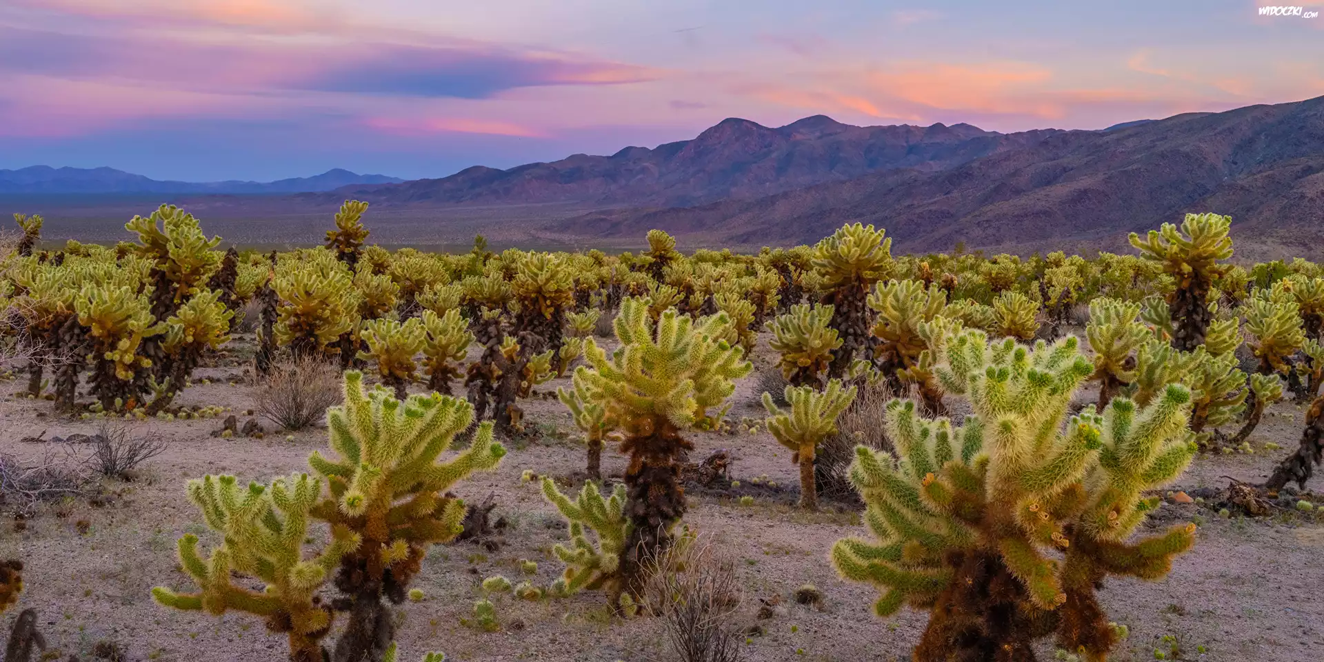 Zdjęcia, Stany Zjednoczone, Kalifornia, Park Narodowy Joshua Tree, Kaktusy, Cholla, Góry