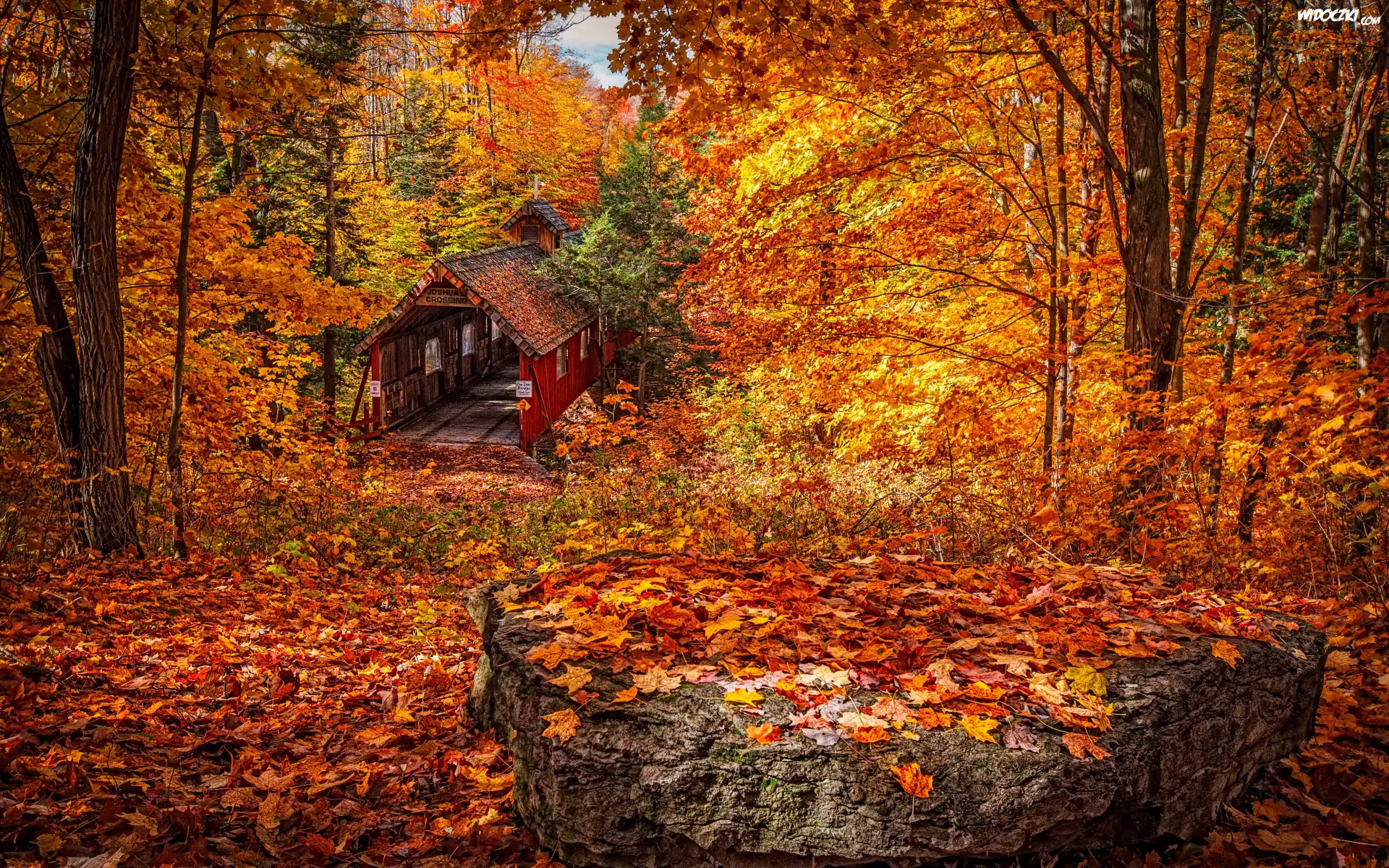 Stany zjednoczone, Stan Michigan, Wieś Lake Ann, Most Joshuas Crossing Covered Bridge, Jesień, Las, Drzewa, Liście, Kamień |